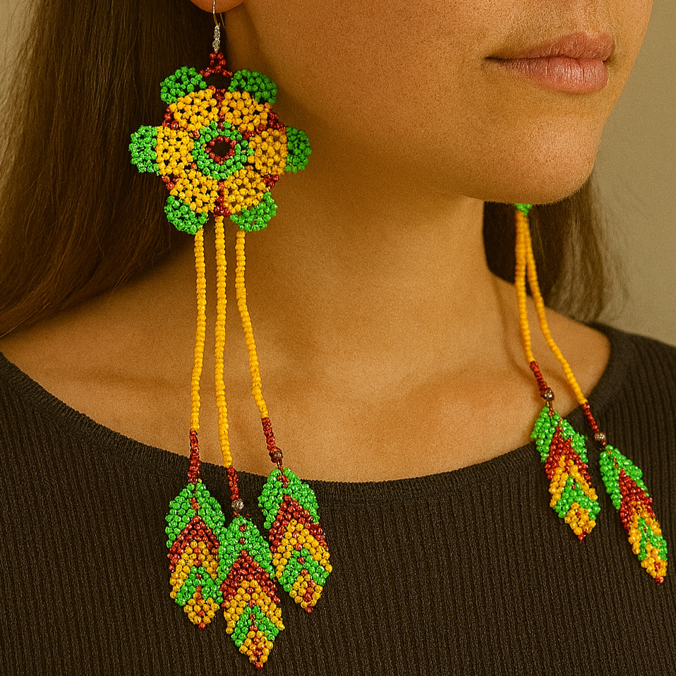 These earrings evoke the warmth and energy of a rising sun. The layered beaded petals form a radiant bloom that cascades into a striking fringe. Whether you’re dressing up a casual look or adding flair to your regalia, these earrings bring color, movement, and cultural pride to any outfit.