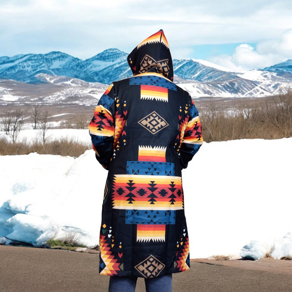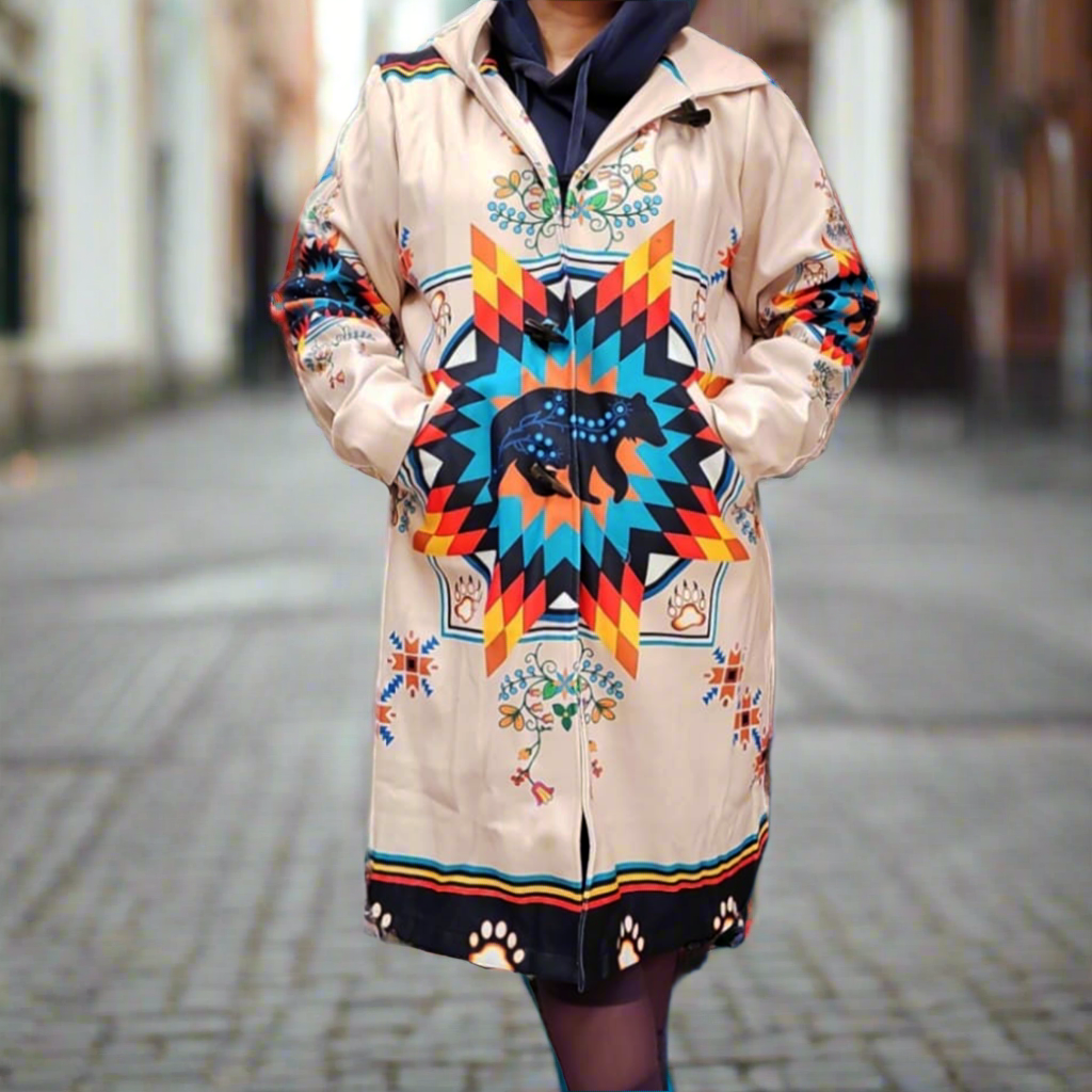 Inspired by Indigenous artistry, our long coats fuse timeless design with modern functionality. Each piece tells a story of heritage and style, made for those who embrace elegance in every season.