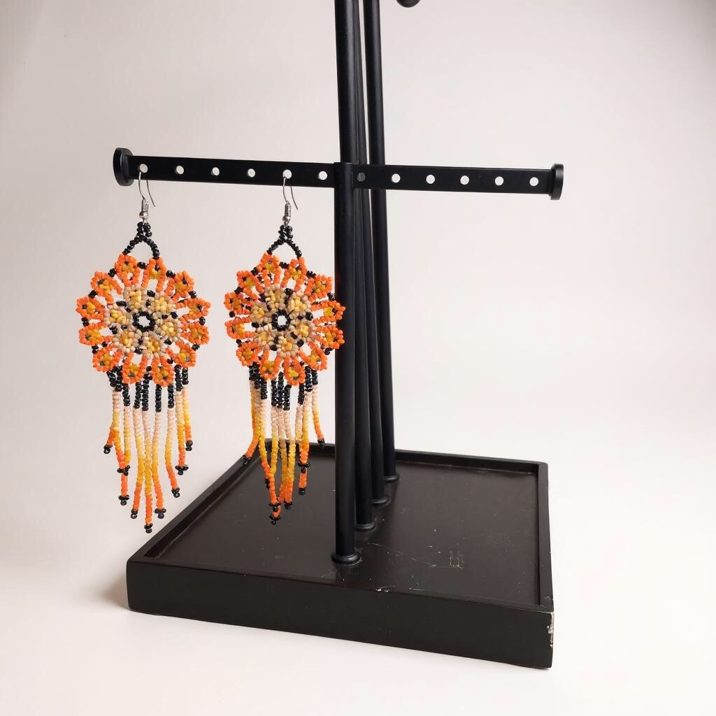 These earrings evoke the warmth and energy of a rising sun. The layered beaded petals form a radiant bloom that cascades into a striking fringe. Whether you’re dressing up a casual look or adding flair to your regalia, these earrings bring color, movement, and cultural pride to any outfit.