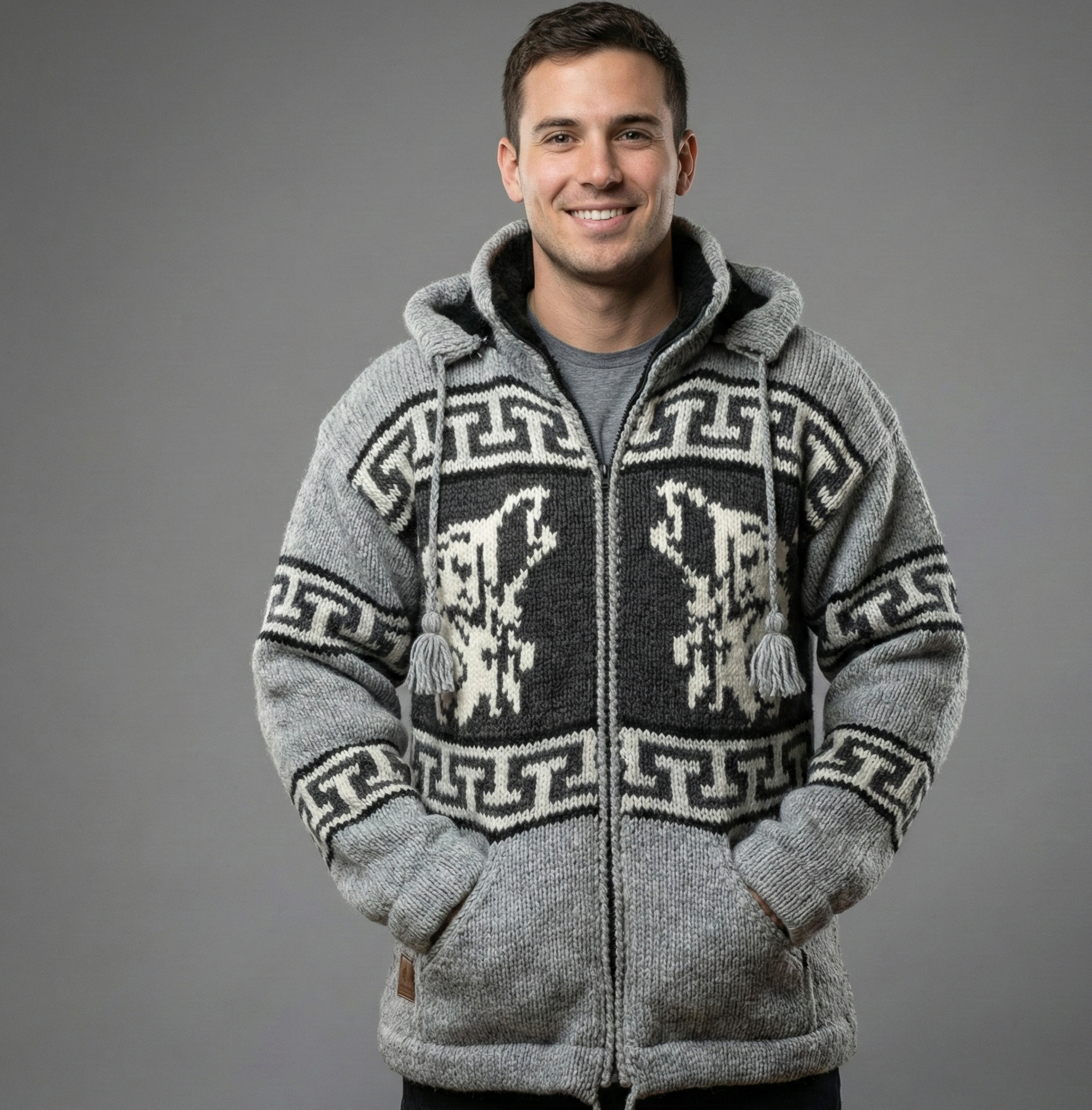 Our jackets come from Indigenous countries—Peru, Guatemala, Mexico, and Ecuador—and are 100% handmade. Our blankets are manufactured in Canada, and our beadwork is made by local artisans in Alberta.