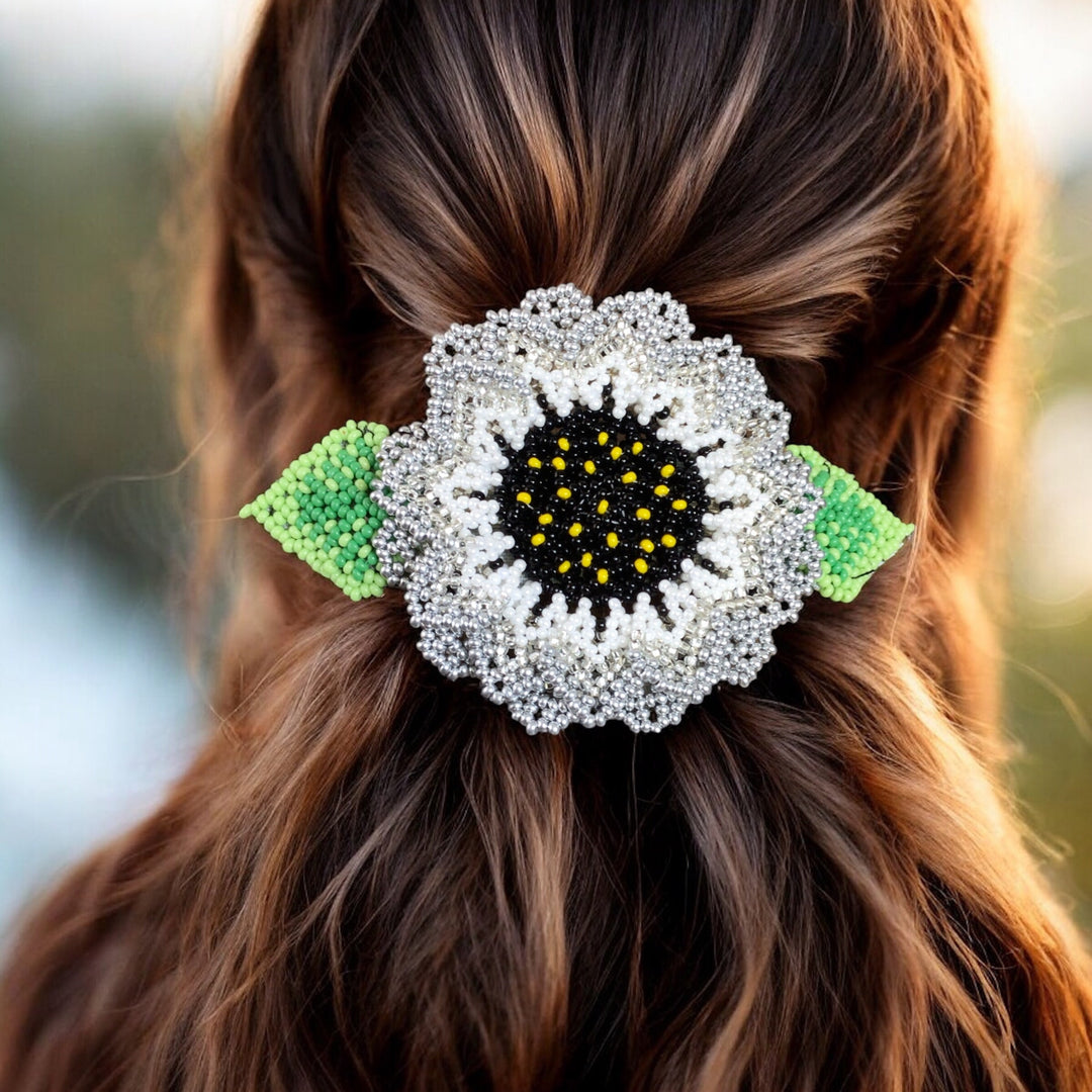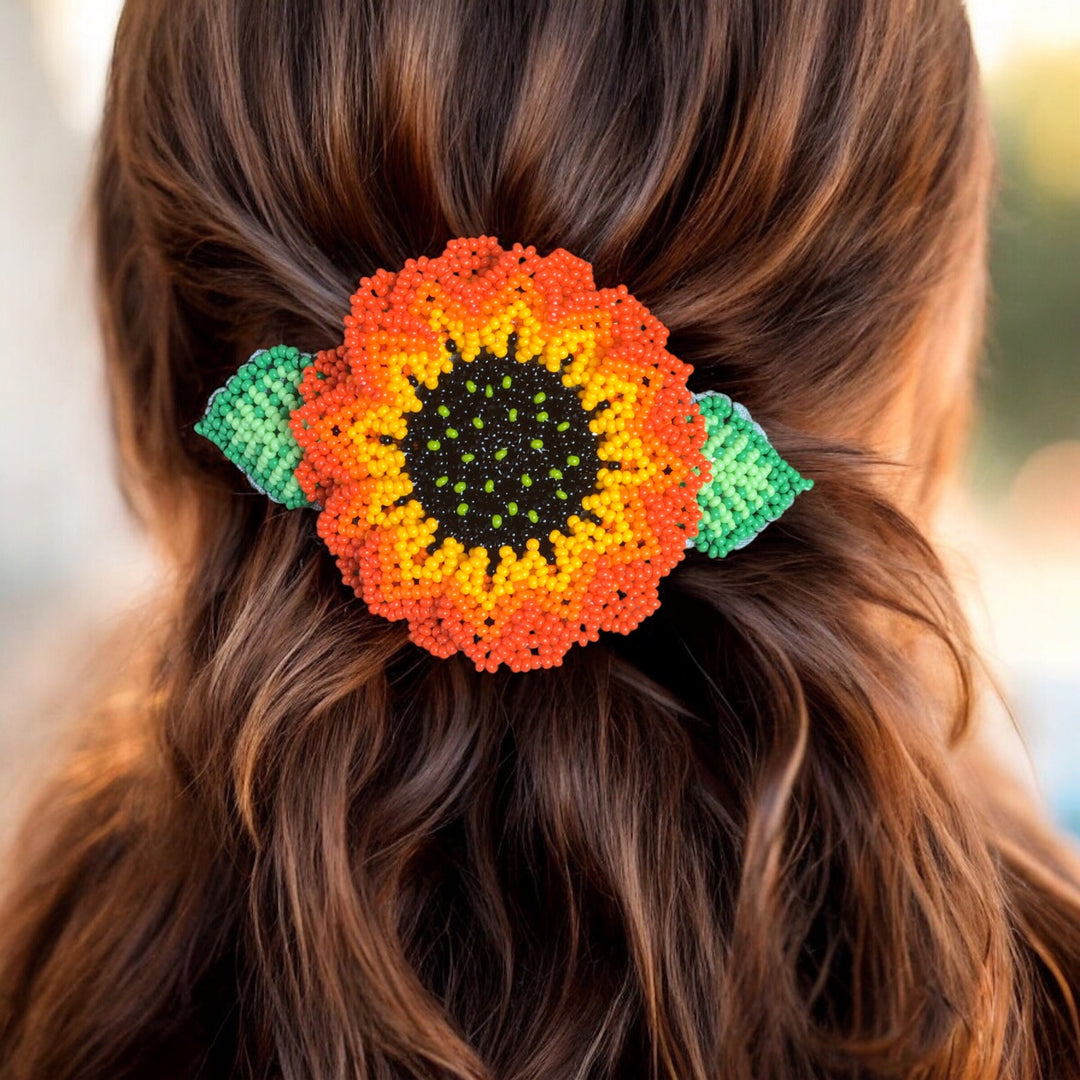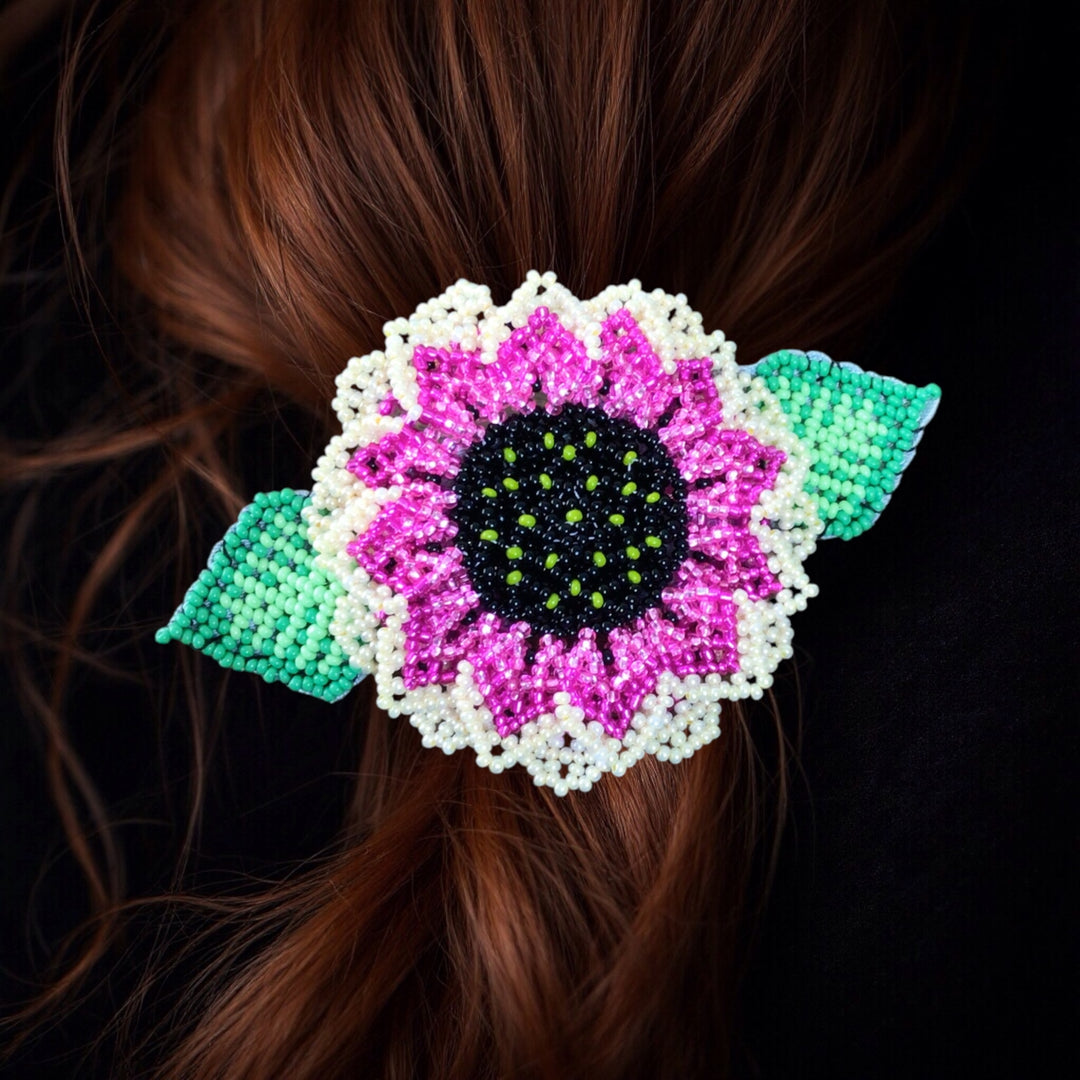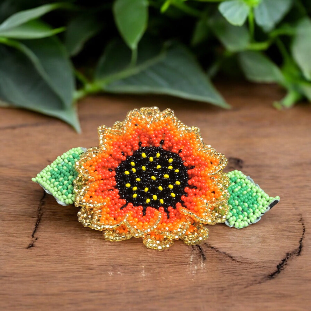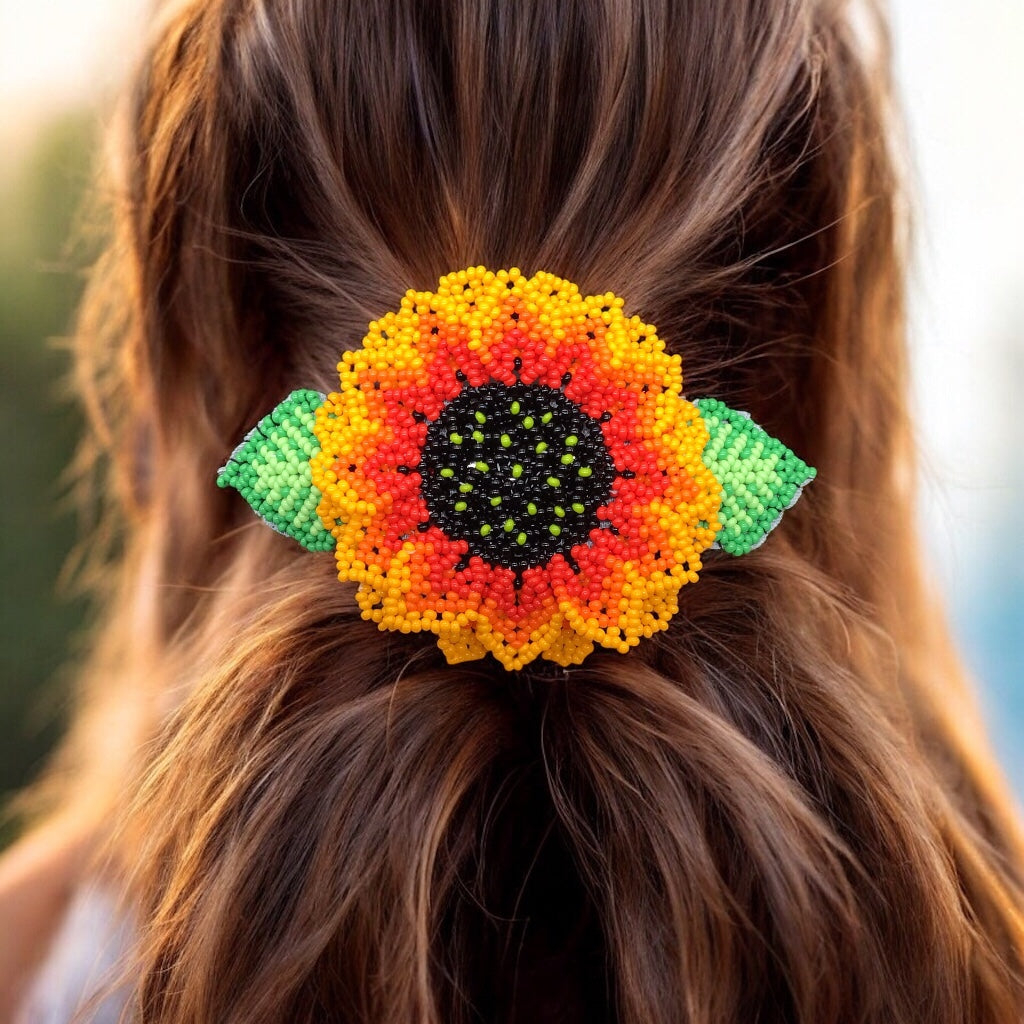 Brighten your hairstyle with this charming Handmade Beaded Sunflower Hair Clip. Carefully crafted with radiant seed beads, this piece captures the joyful essence of a sunflower in bloom.