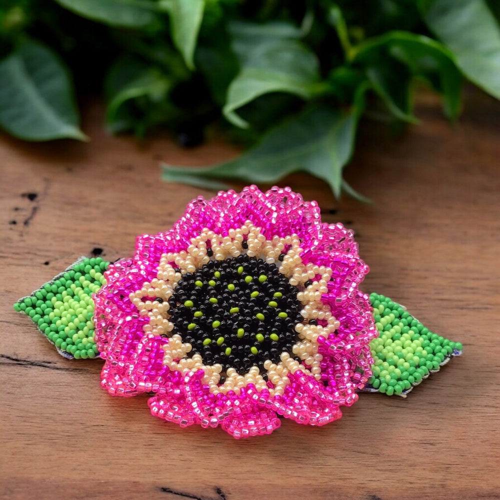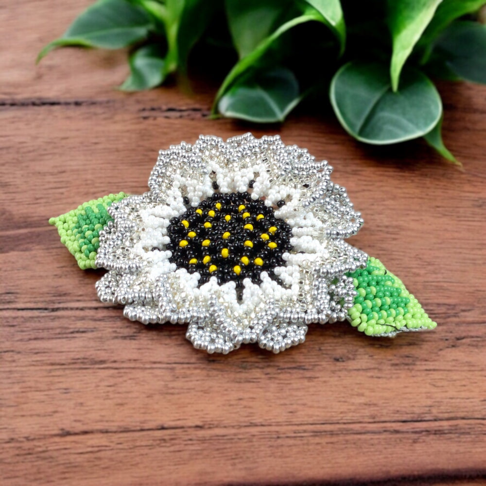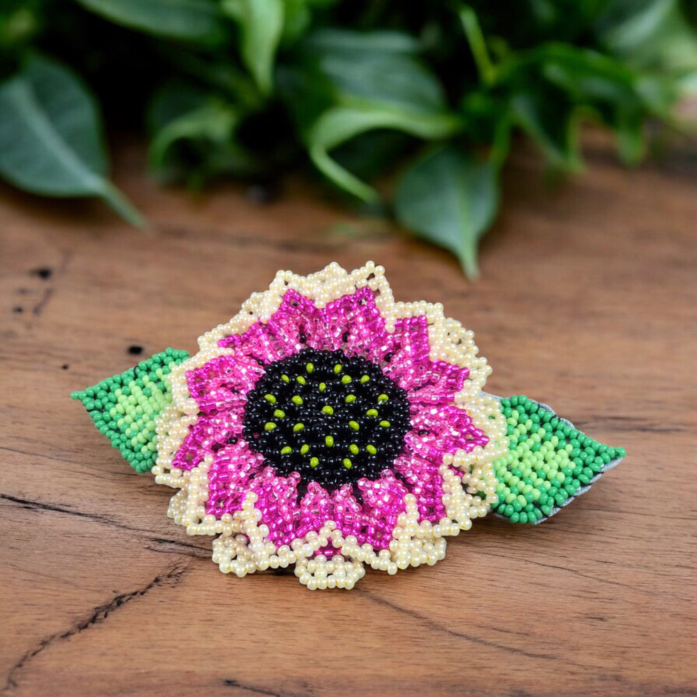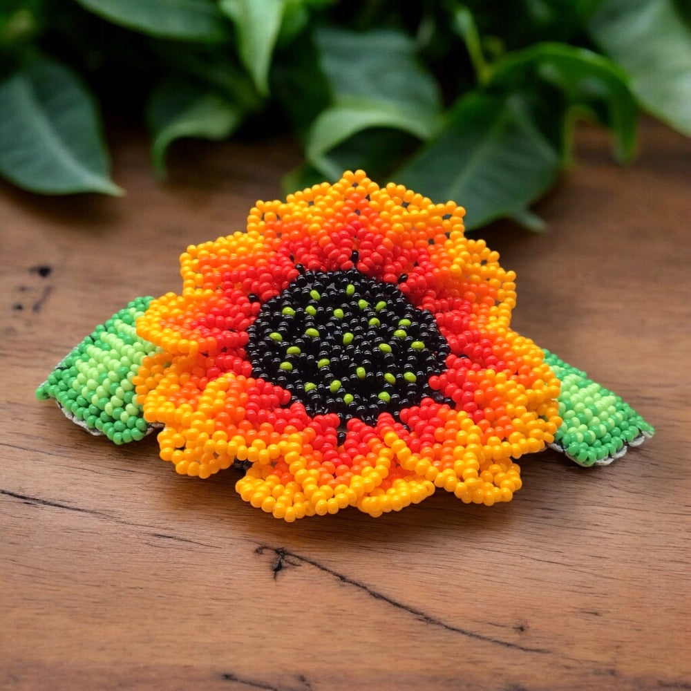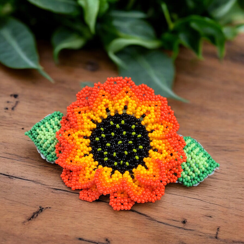 Brighten your hairstyle with this charming Handmade Beaded Sunflower Hair Clip. Carefully crafted with radiant seed beads, this piece captures the joyful essence of a sunflower in bloom.