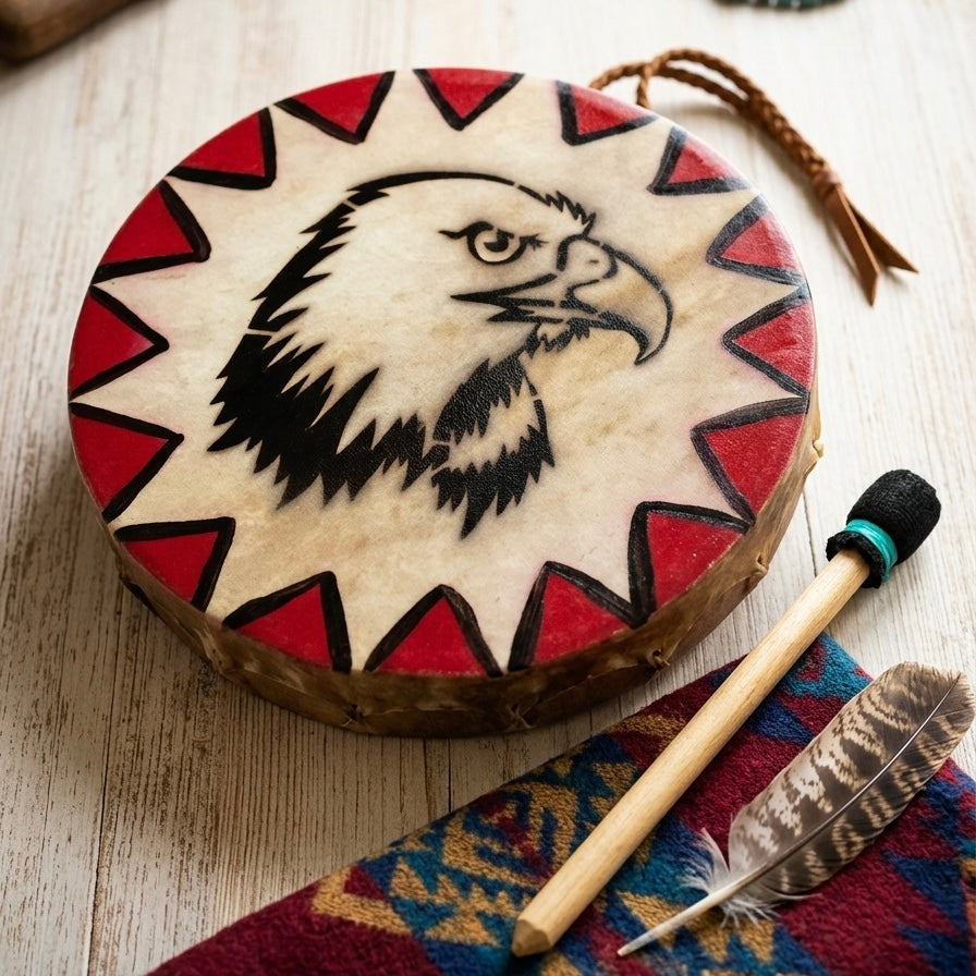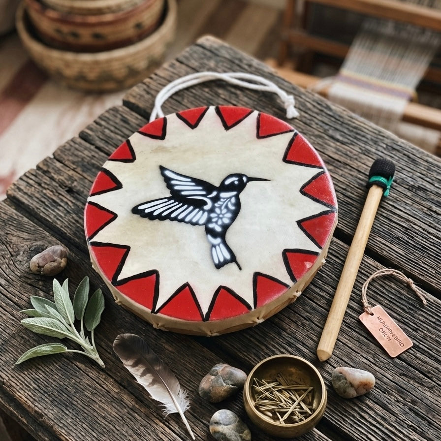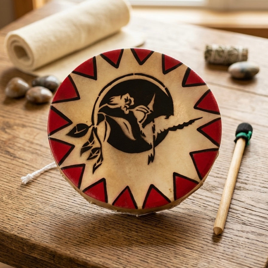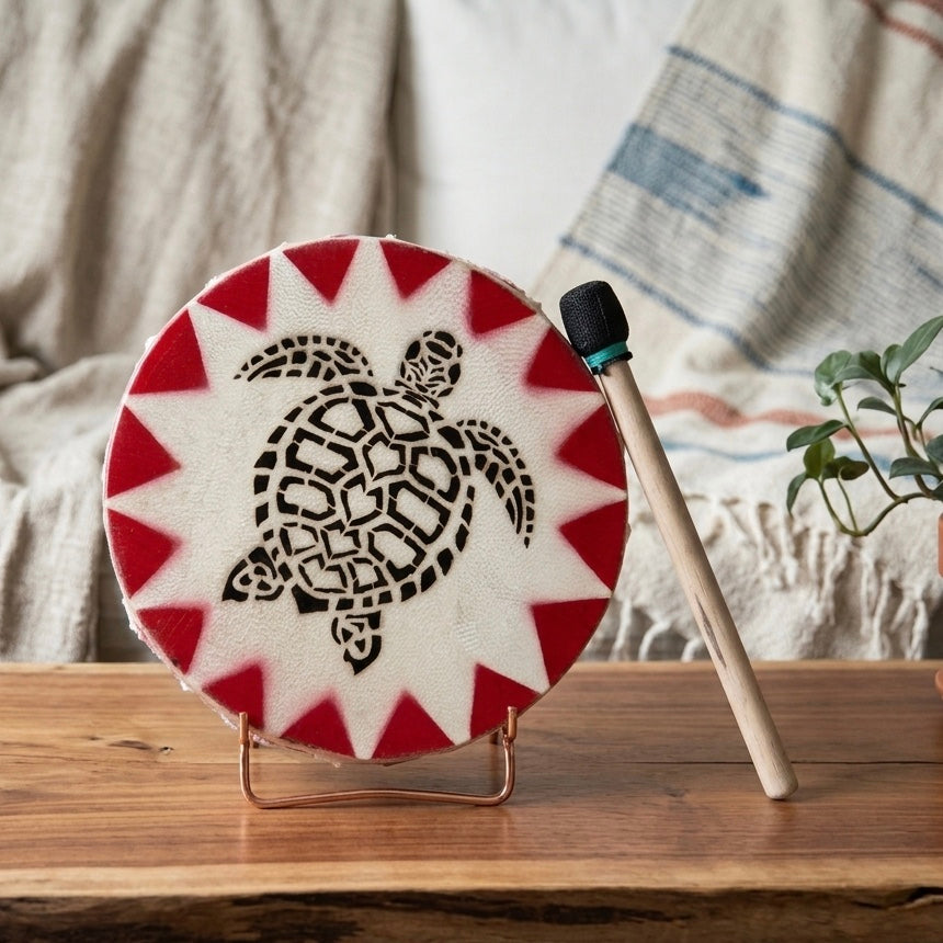 The drum features a striking hand-painted design with bold red accents and a central symbolic motif, making it not only a musical instrument but also a unique piece of art. Its lightweight size makes it easy to carry and ideal for travel, drum circles, or home use.