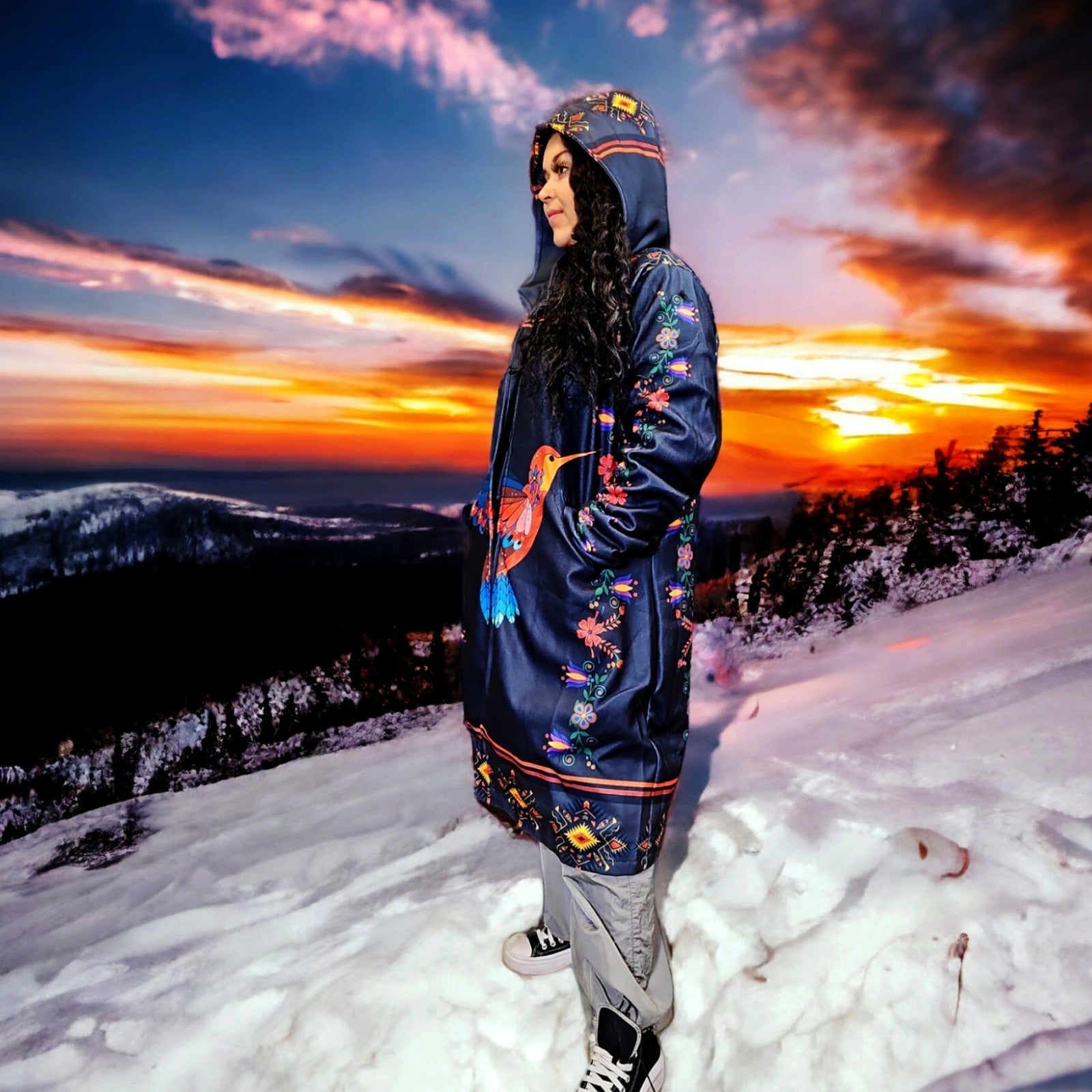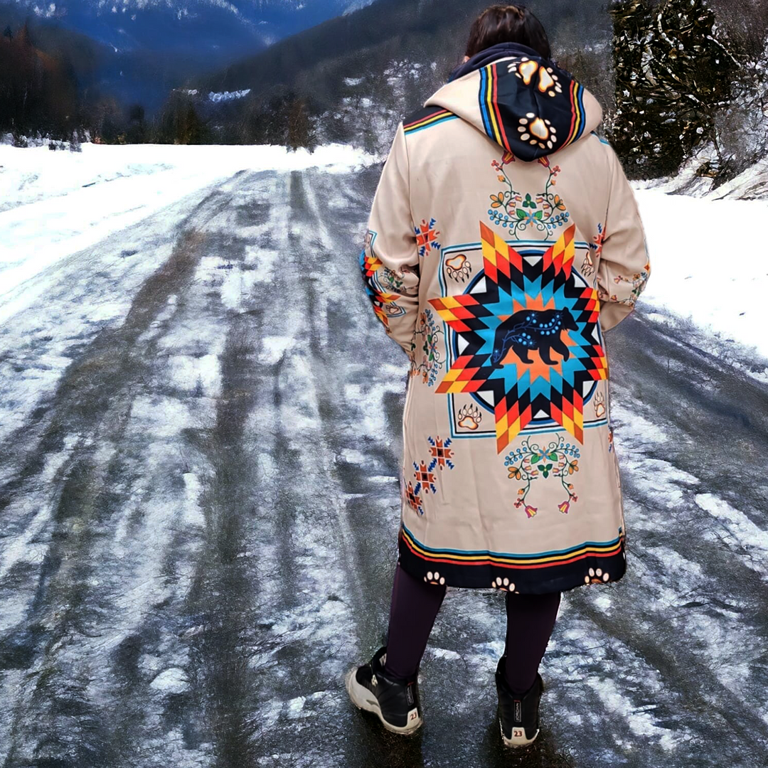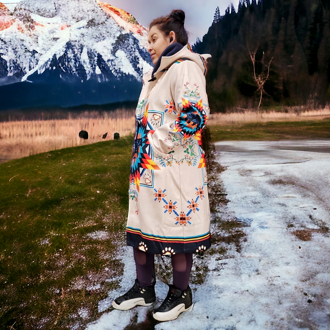 Our jackets come from Indigenous countries—Peru, Guatemala, Mexico, and Ecuador—and are 100% handmade. Our blankets are manufactured in Canada, and our beadwork is made by local artisans in Alberta.