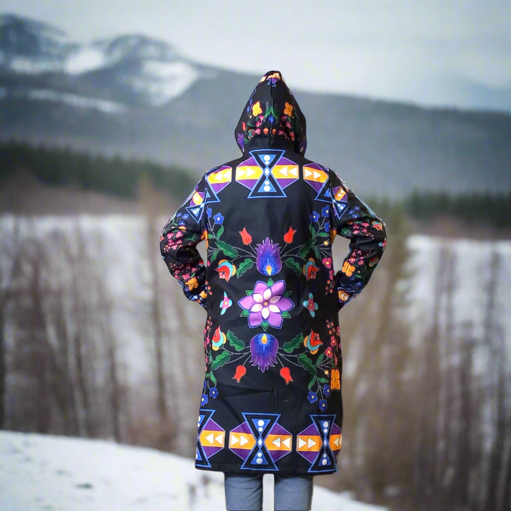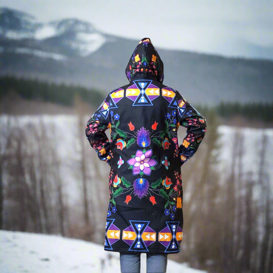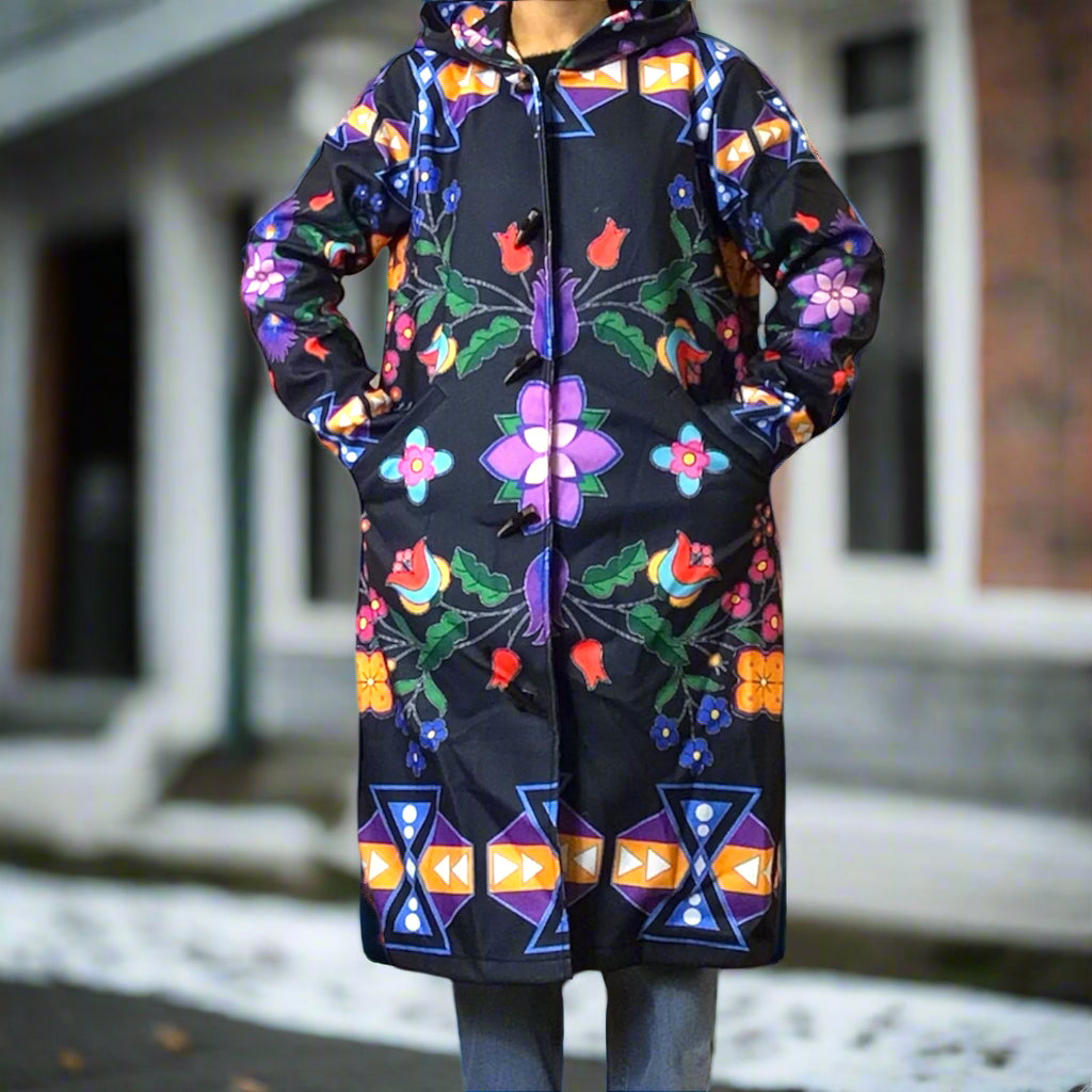 Our jackets come from Indigenous countries—Peru, Guatemala, Mexico, and Ecuador—and are 100% handmade. Our blankets are manufactured in Canada, and our beadwork is made by local artisans in Alberta.
