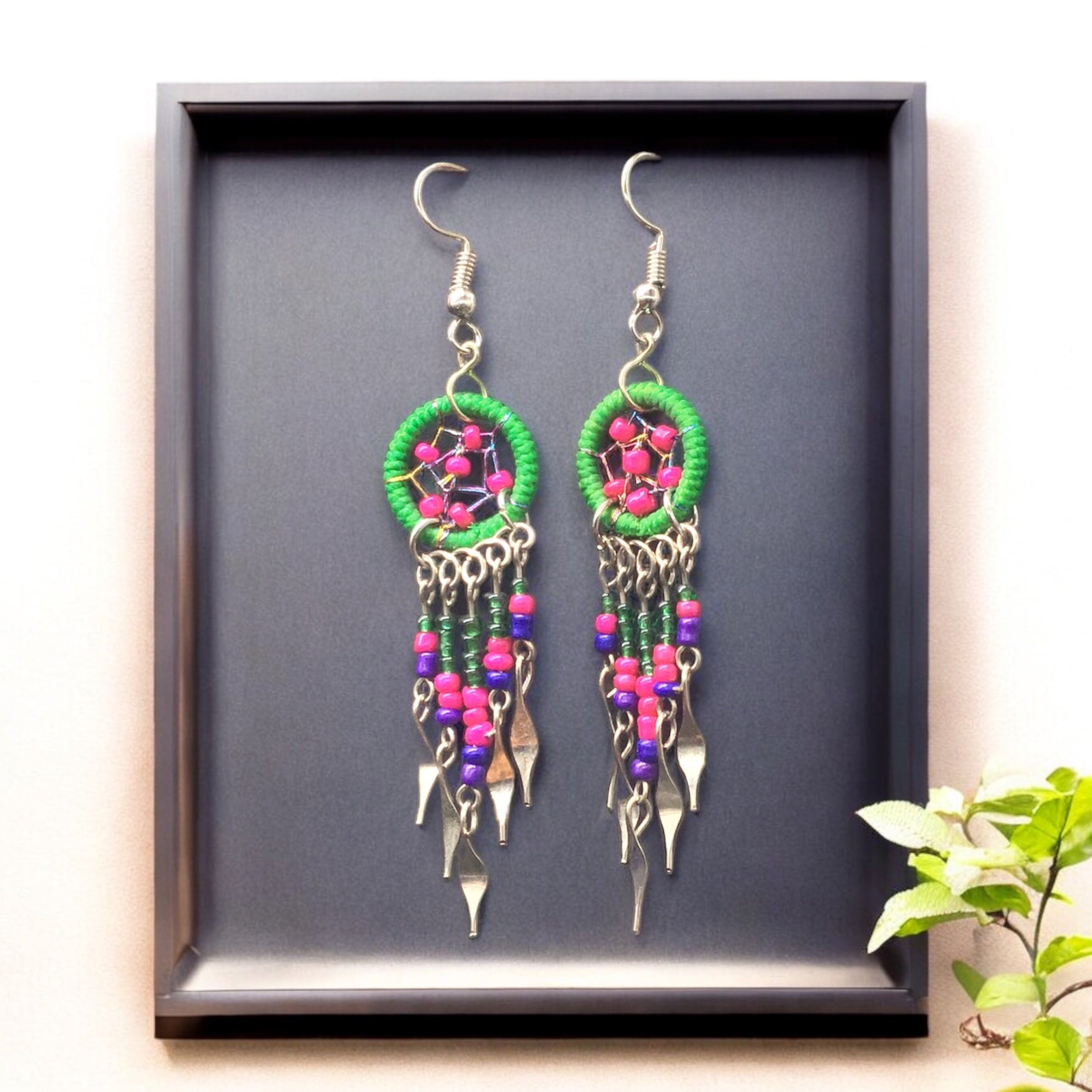 Add a mystical touch to your look with the Celestial Beaded Dreamcatcher Earrings. Featuring a vibrant, multi-colored bead design, these boho-chic earrings combine elegance with protection. Perfect for festivals, casual outings, or everyday wear, they’re a lightweight accessory that brings both beauty and positive energy to any outfit.