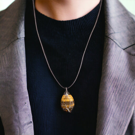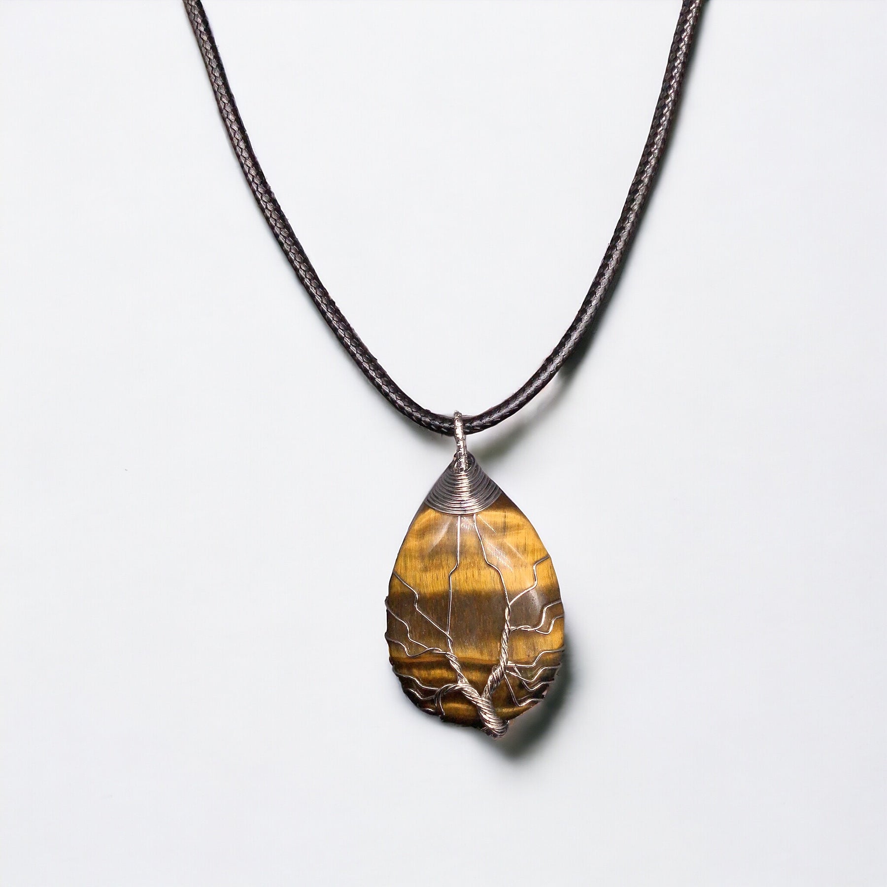 Yellow golden tiger eyes Gemstone Pendant Wrapped w/ Silver Tree of Life