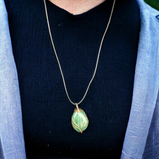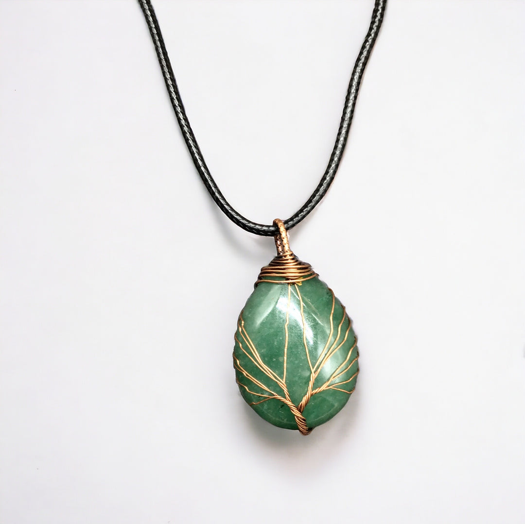 Green Gemstone Pendant Wrapped w/ Gold Tree of Life
