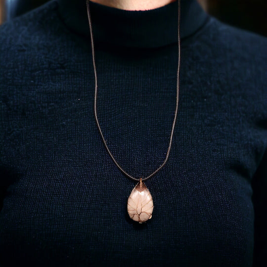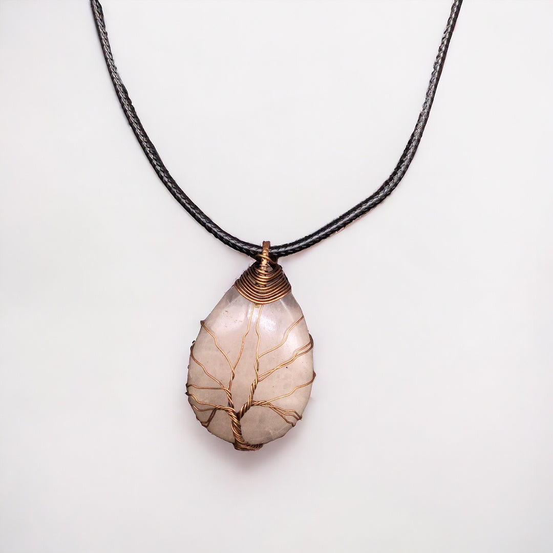 Light pink Gemstone Pendant Wrapped w/ bronze Tree of Life