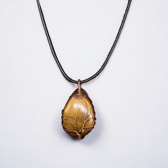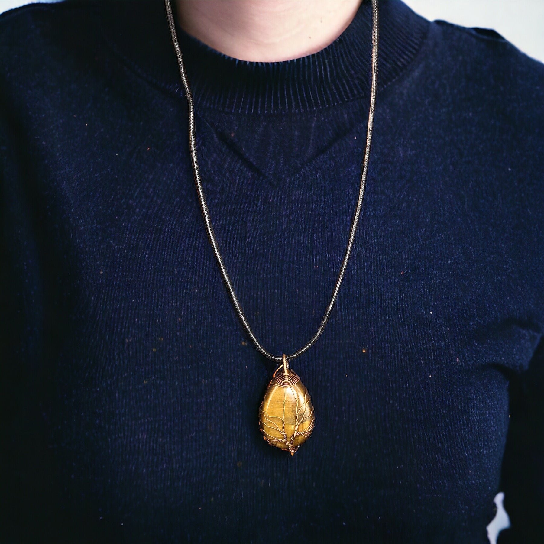 Yellow golden tiger eyes Gemstone Pendant Wrapped w/ bronze Tree of Life