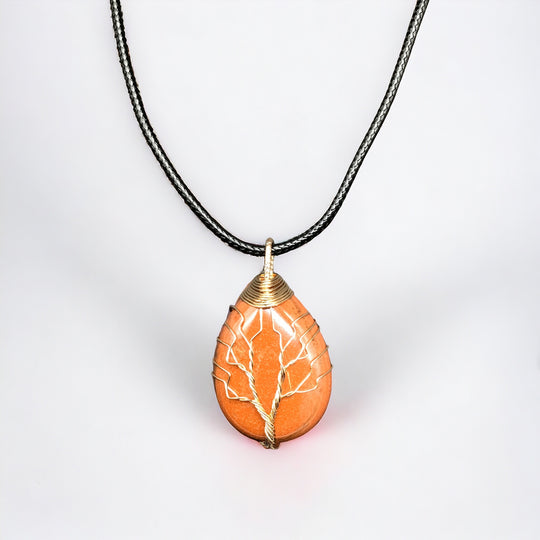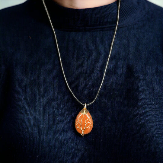 Orange Gemstone Pendant Wrapped w/ Gold Tree of Life