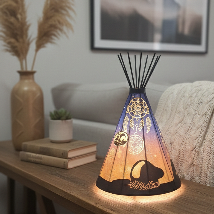 The Teepee Table Lamp is a compact and efficient lighting fixture designed for indoor residential use. Inspired by Native American teepee structures, it combines stable performance with cultural aesthetics. The unit operates on standard household voltage (AC 110–130V) and includes a low-power LED filament bulb for energy-efficient illumination.