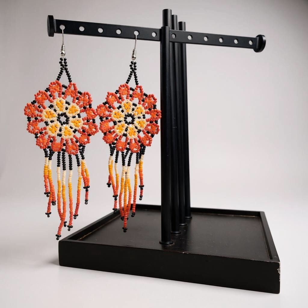 These earrings evoke the warmth and energy of a rising sun. The layered beaded petals form a radiant bloom that cascades into a striking fringe. Whether you’re dressing up a casual look or adding flair to your regalia, these earrings bring color, movement, and cultural pride to any outfit.