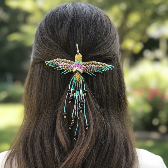 This stunning barrette showcases the artistry of Indigenous-inspired beadwork, featuring a radiant hummingbird design that symbolizes joy, energy, and renewal.