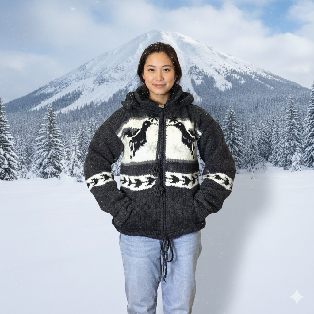 Our jackets come from Indigenous countries—Peru, Guatemala, Mexico, and Ecuador—and are 100% handmade. Our blankets are manufactured in Canada, and our beadwork is made by local artisans in Alberta.