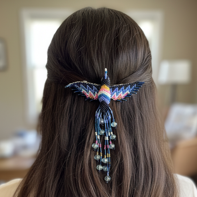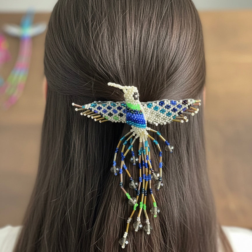 This stunning barrette showcases the artistry of Indigenous-inspired beadwork, featuring a radiant hummingbird design that symbolizes joy, energy, and renewal.