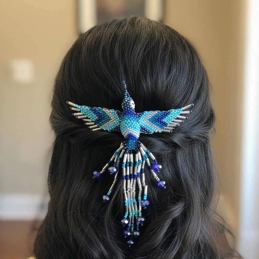 This stunning barrette showcases the artistry of Indigenous-inspired beadwork, featuring a radiant hummingbird design that symbolizes joy, energy, and renewal.