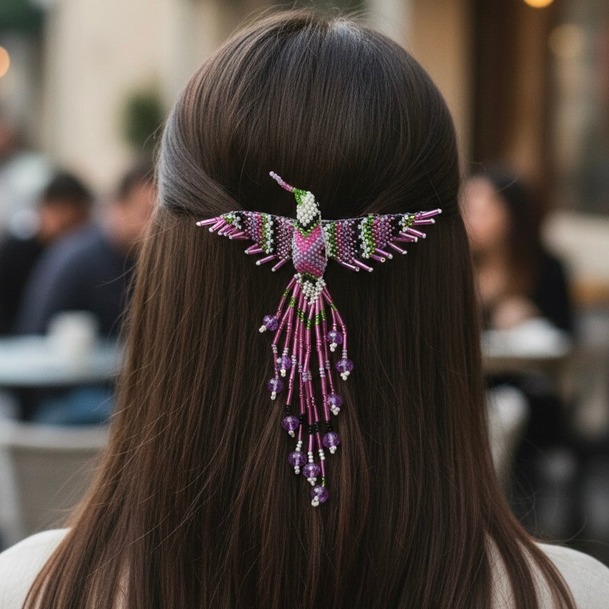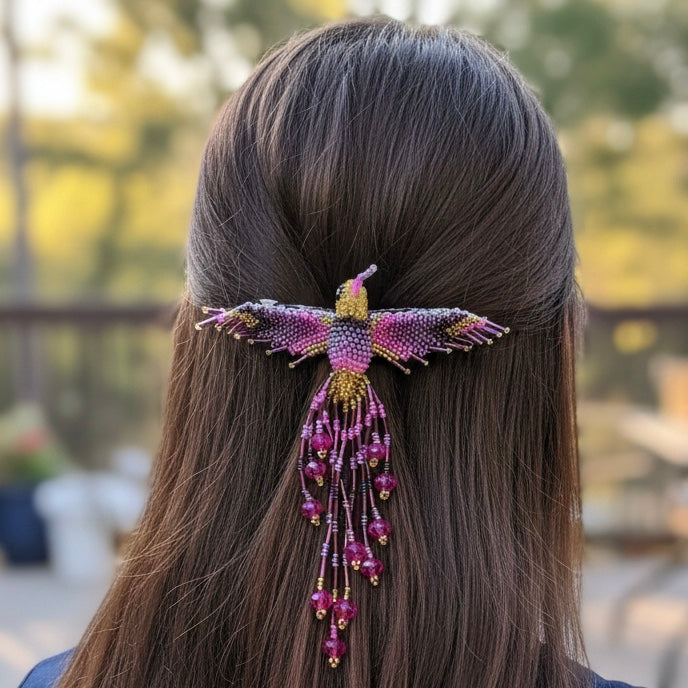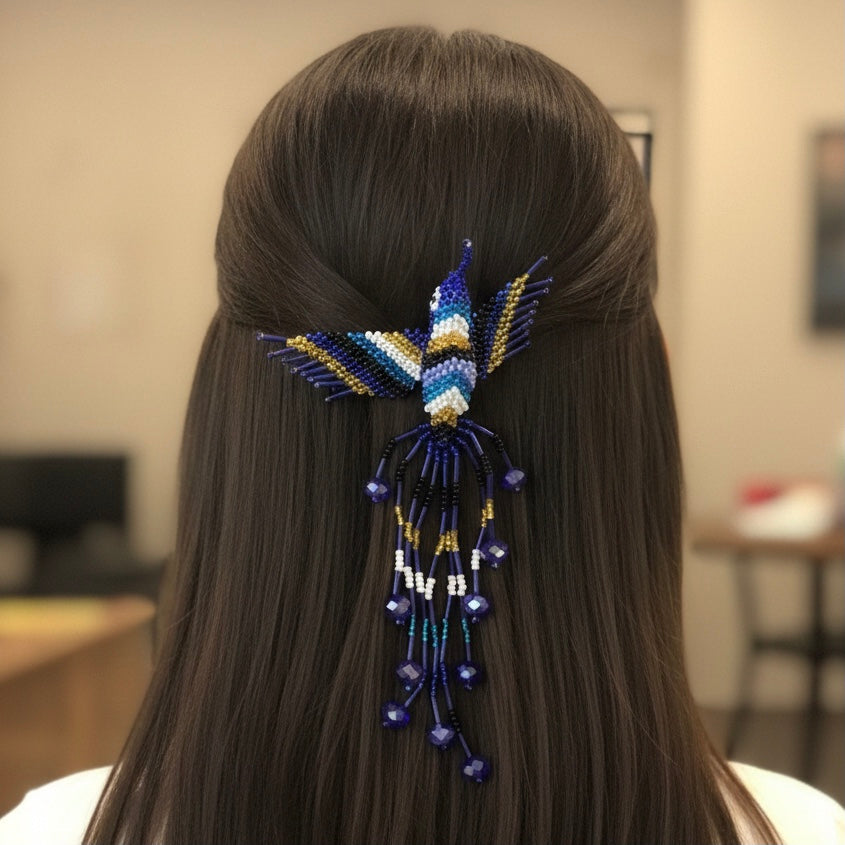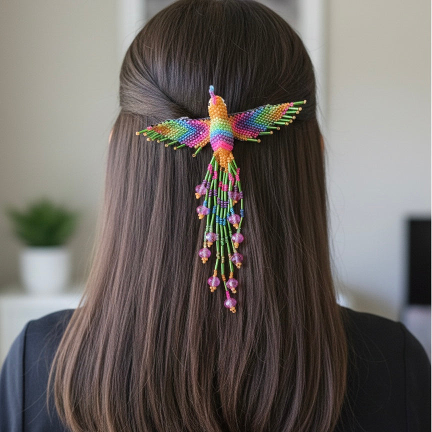 This stunning barrette showcases the artistry of Indigenous-inspired beadwork, featuring a radiant hummingbird design that symbolizes joy, energy, and renewal.