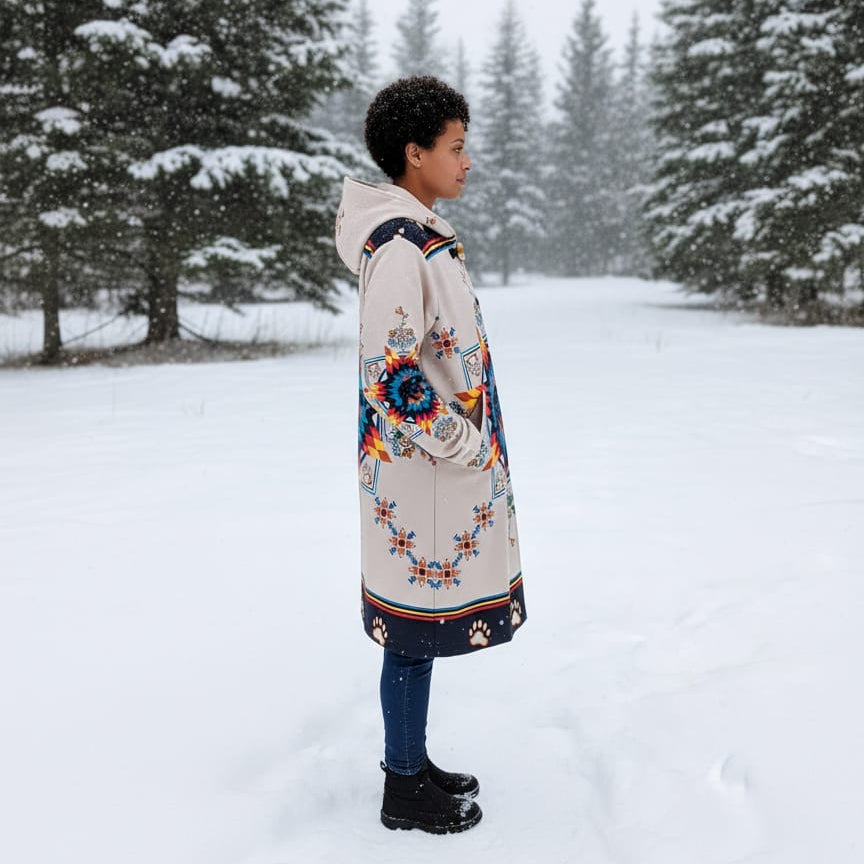 Our jackets come from Indigenous countries—Peru, Guatemala, Mexico, and Ecuador—and are 100% handmade. Our blankets are manufactured in Canada, and our beadwork is made by local artisans in Alberta.