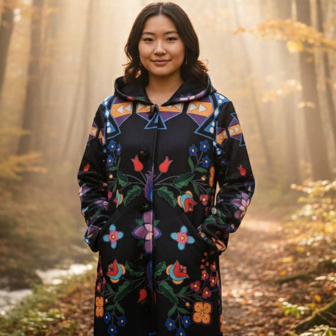Our jackets come from Indigenous countries—Peru, Guatemala, Mexico, and Ecuador—and are 100% handmade. Our blankets are manufactured in Canada, and our beadwork is made by local artisans in Alberta.