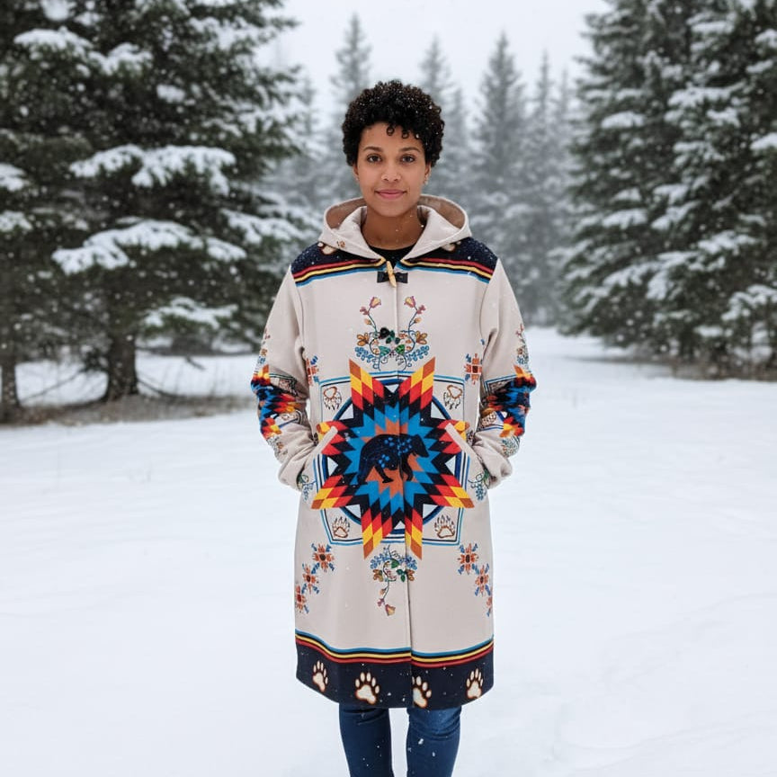 Our jackets come from Indigenous countries—Peru, Guatemala, Mexico, and Ecuador—and are 100% handmade. Our blankets are manufactured in Canada, and our beadwork is made by local artisans in Alberta.
