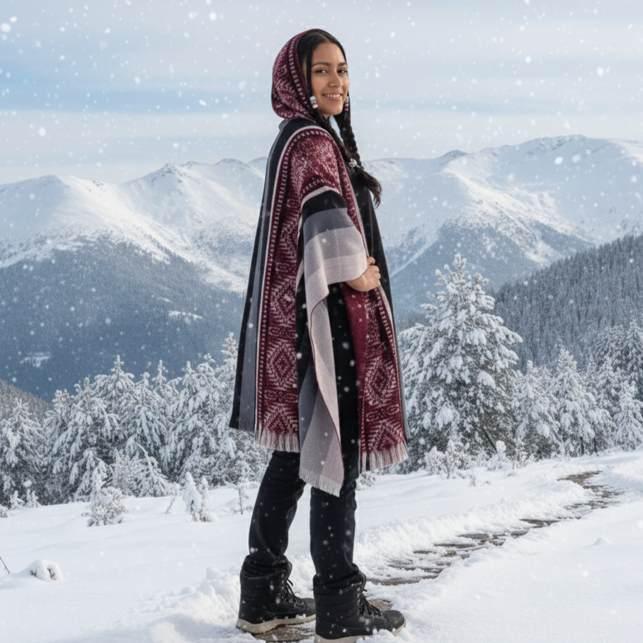 Our jackets come from Indigenous countries—Peru, Guatemala, Mexico, and Ecuador—and are 100% handmade. Our blankets are manufactured in Canada, and our beadwork is made by local artisans in Alberta.