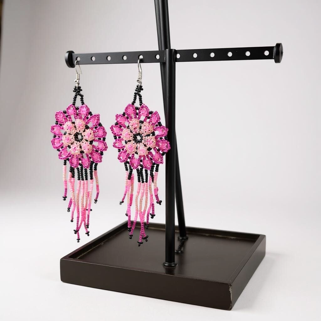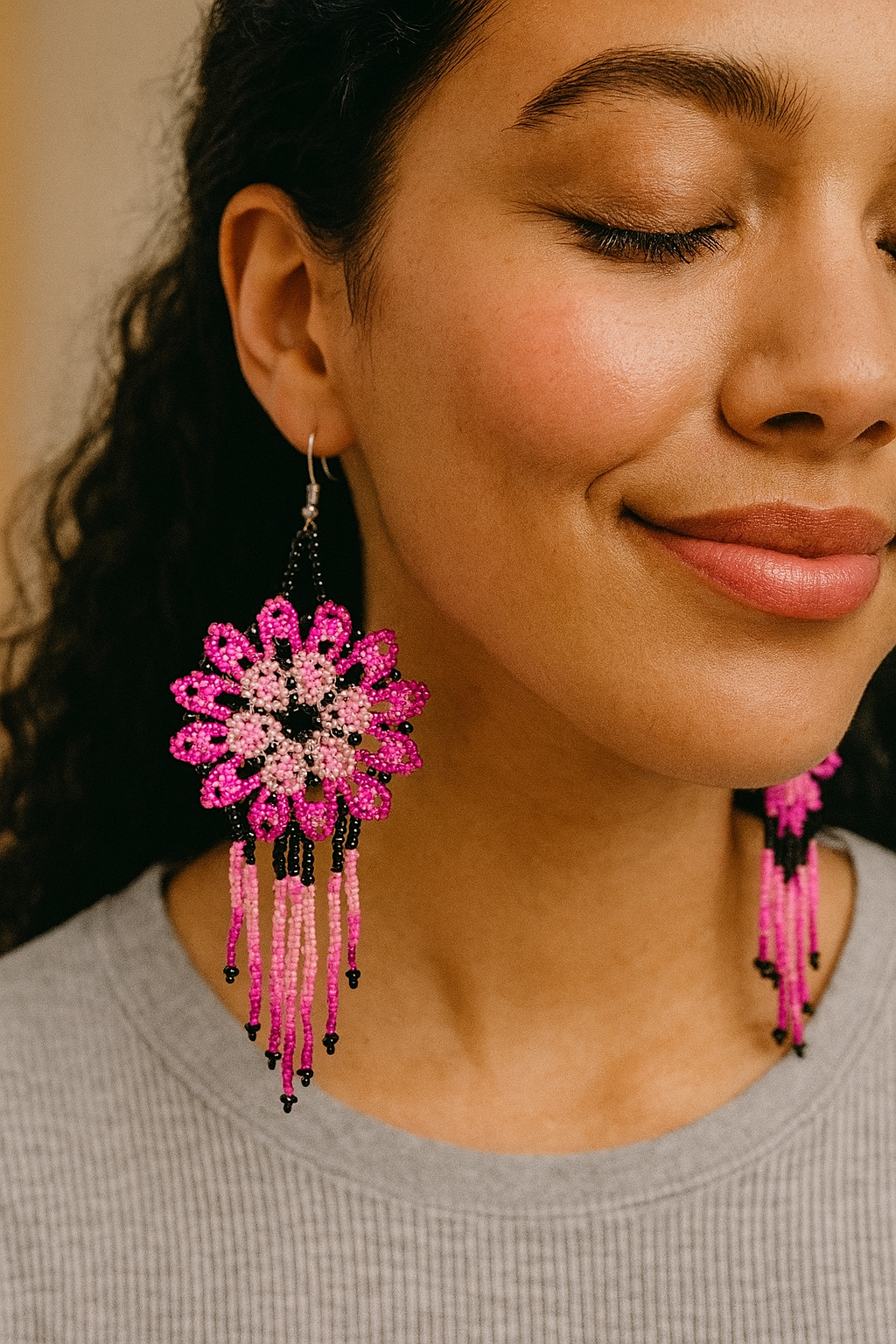 These earrings evoke the warmth and energy of a rising sun. The layered beaded petals form a radiant bloom that cascades into a striking fringe. Whether you’re dressing up a casual look or adding flair to your regalia, these earrings bring color, movement, and cultural pride to any outfit.