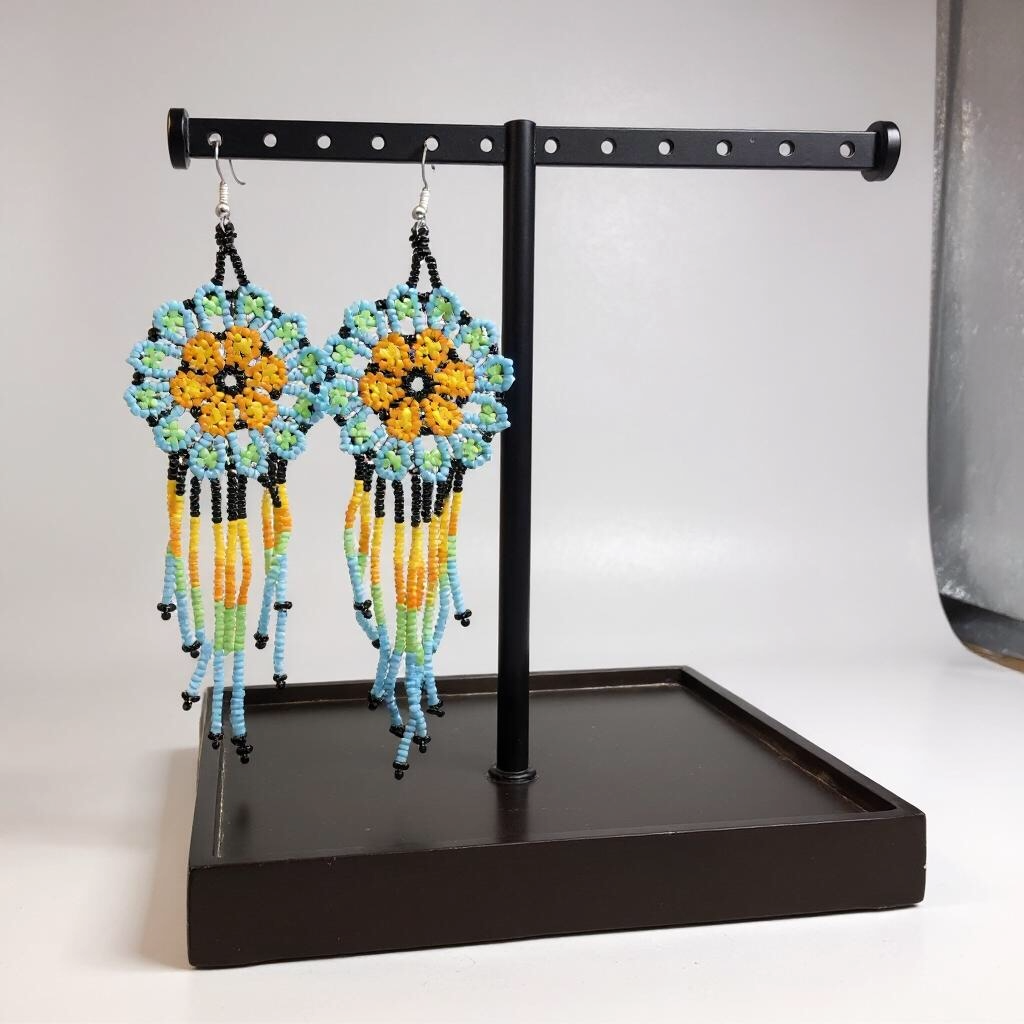 These earrings evoke the warmth and energy of a rising sun. The layered beaded petals form a radiant bloom that cascades into a striking fringe. Whether you’re dressing up a casual look or adding flair to your regalia, these earrings bring color, movement, and cultural pride to any outfit.