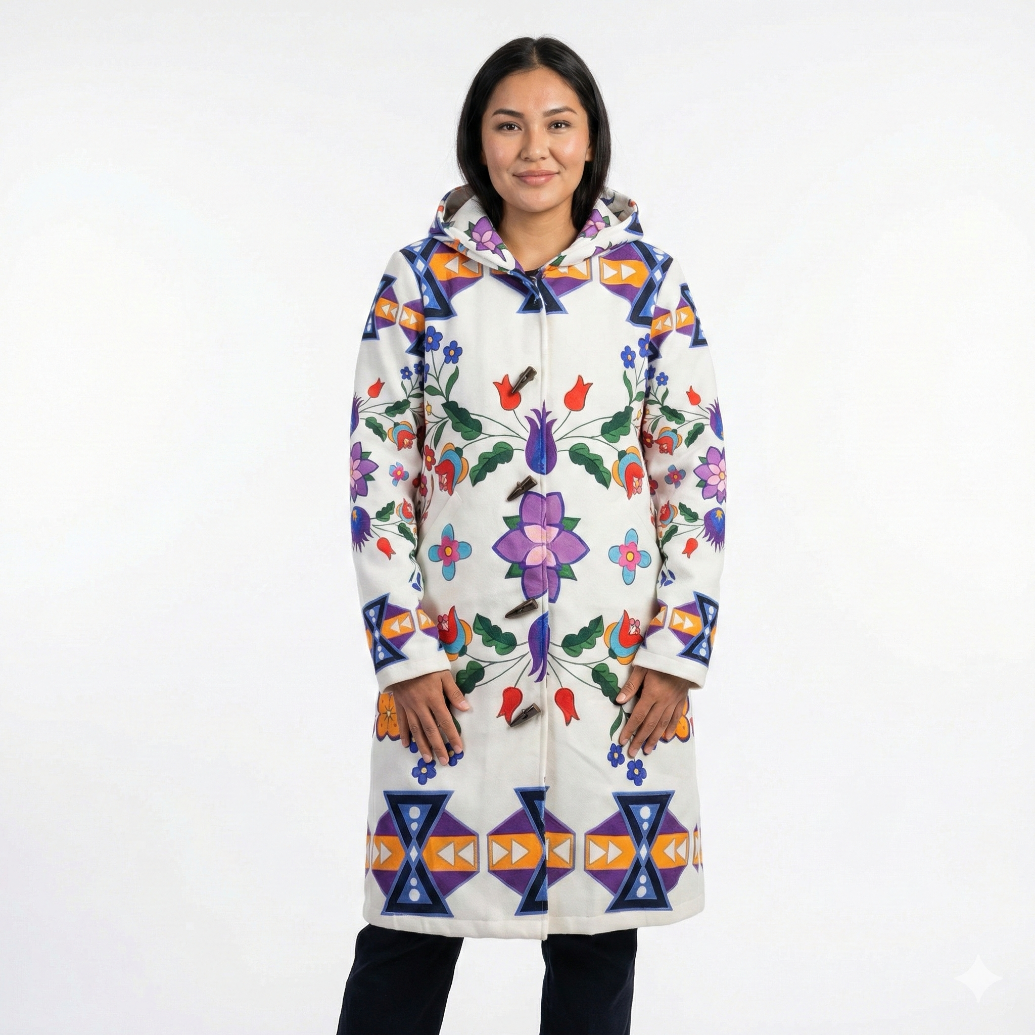 Our jackets come from Indigenous countries—Peru, Guatemala, Mexico, and Ecuador—and are 100% handmade. Our blankets are manufactured in Canada, and our beadwork is made by local artisans in Alberta.