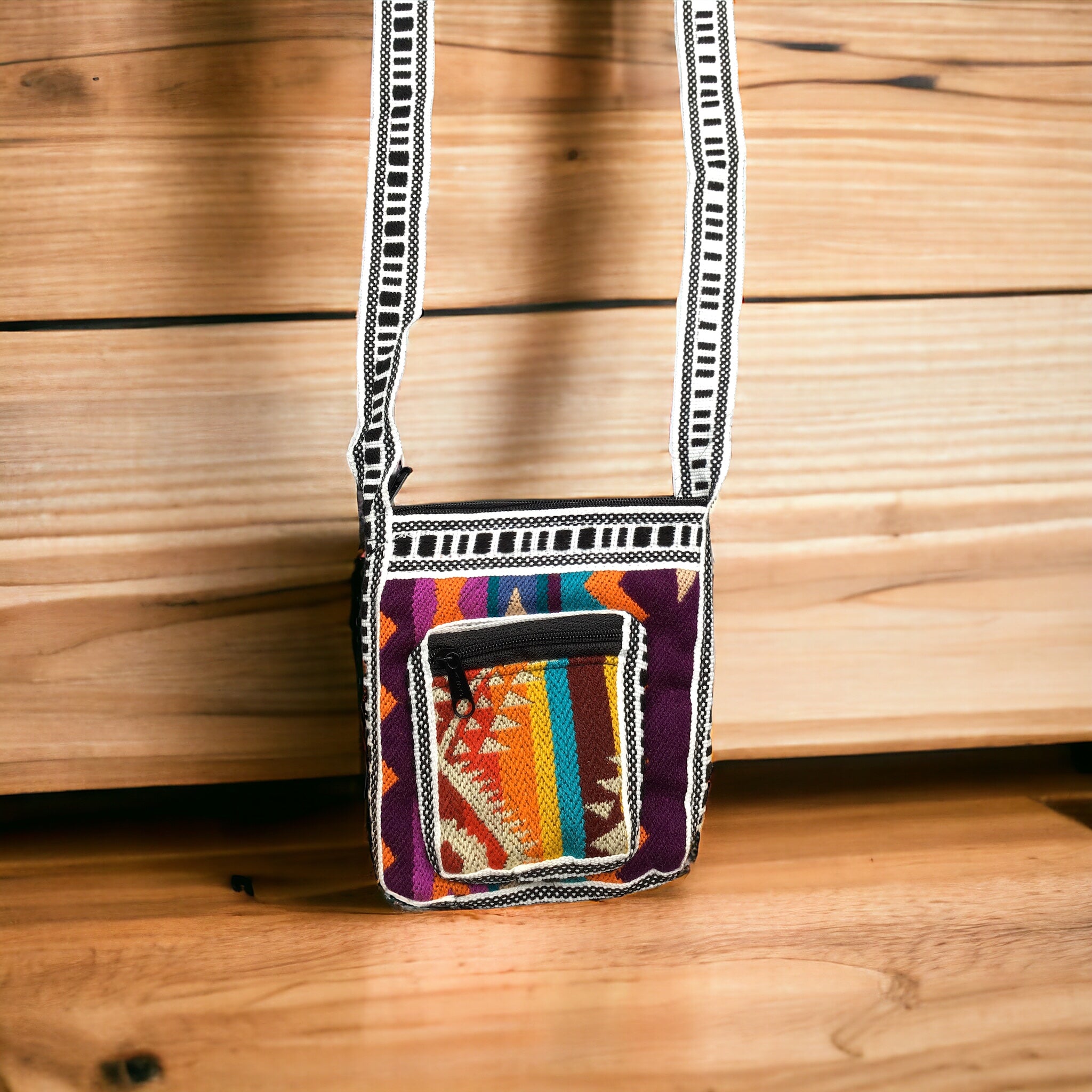 Introducing our exquisite handmade crossbody bag, featuring a vibrant tribal pattern that adds a pop of color to any outfit. This stylish accessory measures 4.5 by 5.5 inches, making it the perfect size to carry your essentials while on the go.