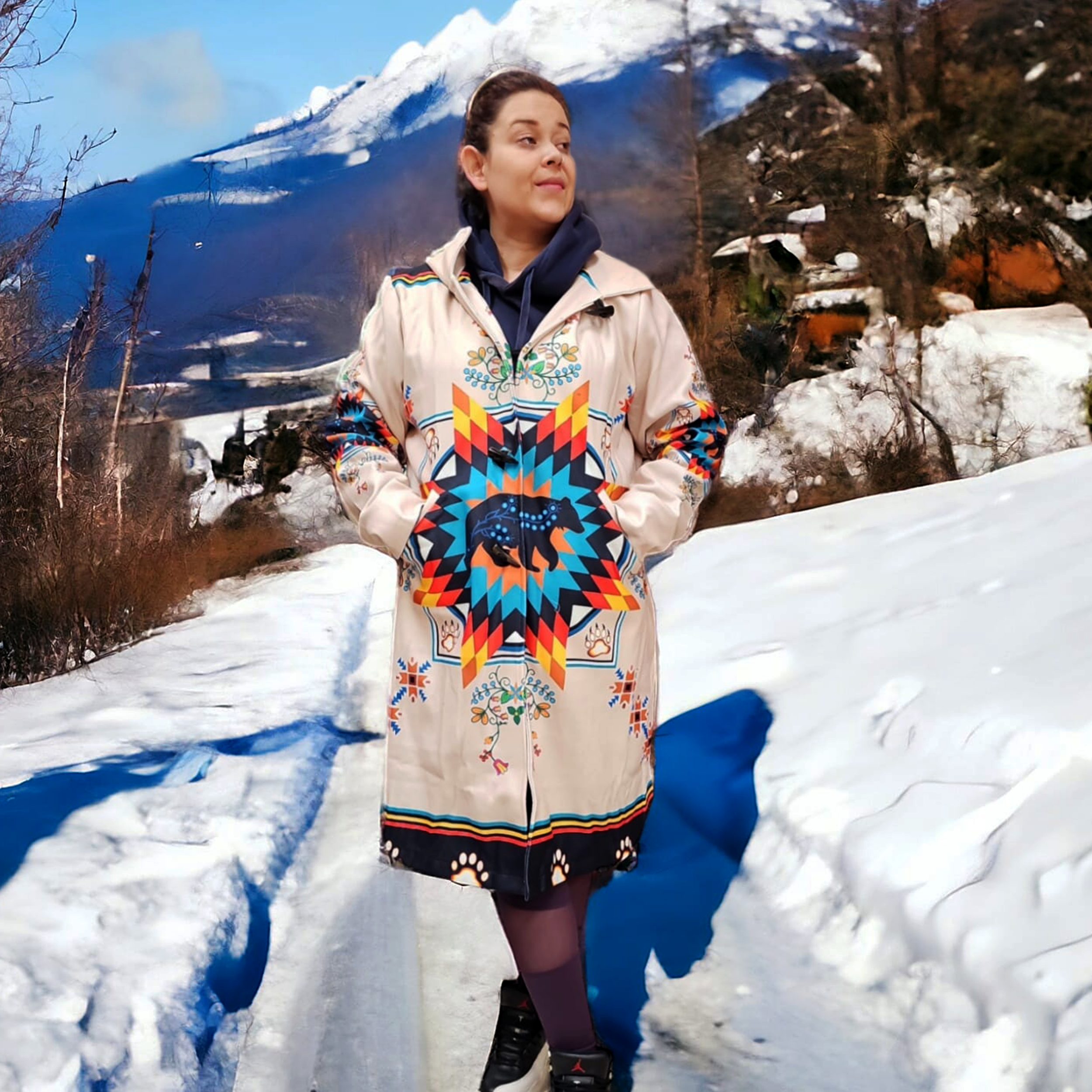 Our jackets come from Indigenous countries—Peru, Guatemala, Mexico, and Ecuador—and are 100% handmade. Our blankets are manufactured in Canada, and our beadwork is made by local artisans in Alberta.