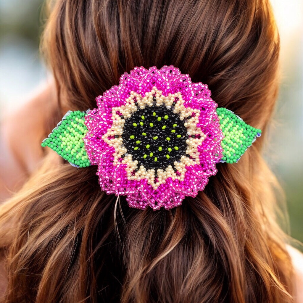 Brighten your hairstyle with this charming Handmade Beaded Sunflower Hair Clip. Carefully crafted with radiant seed beads, this piece captures the joyful essence of a sunflower in bloom.