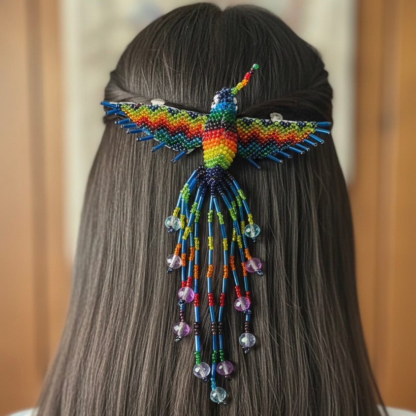 This stunning barrette showcases the artistry of Indigenous-inspired beadwork, featuring a radiant hummingbird design that symbolizes joy, energy, and renewal.