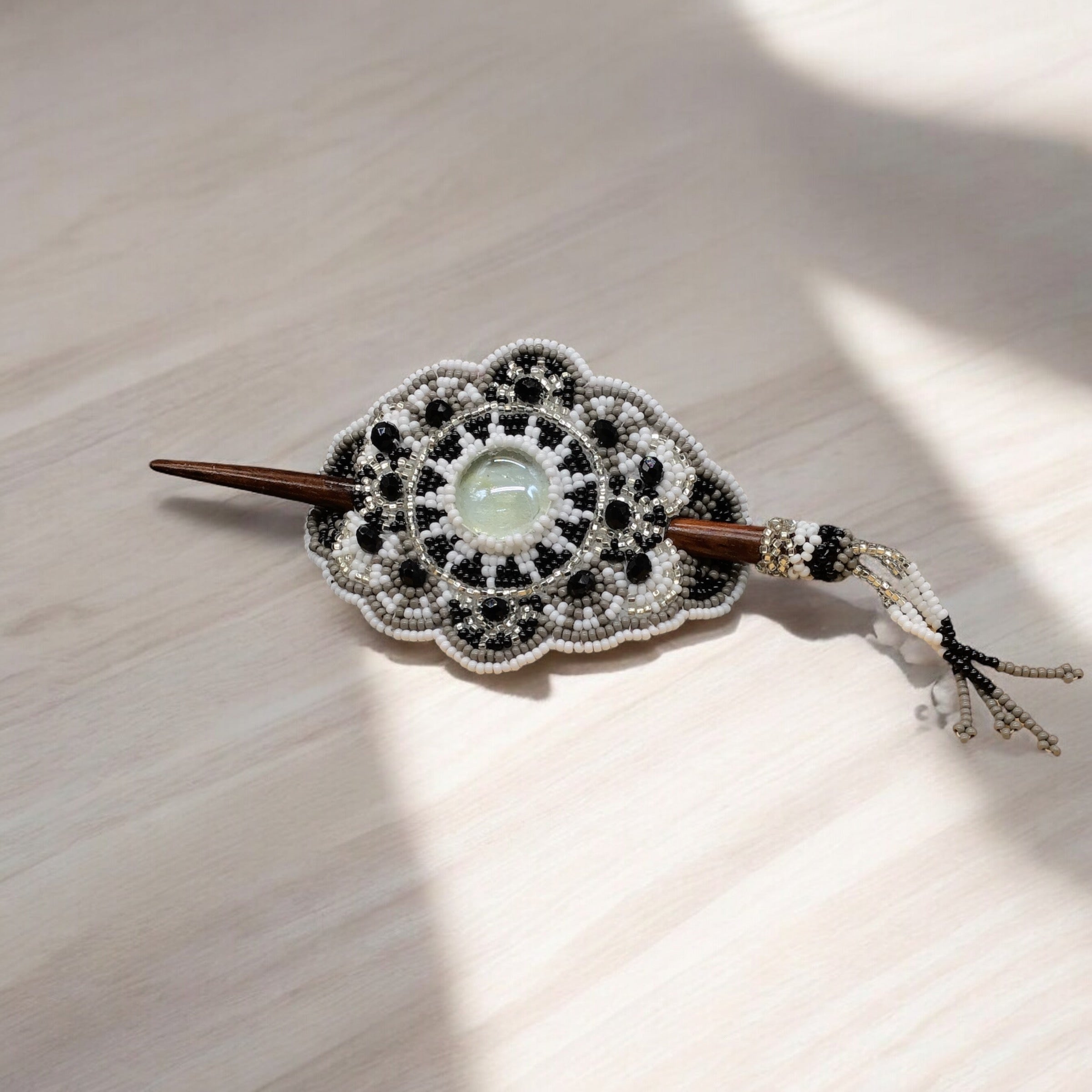 Native American Style Barrette measuring 12 cm wide 11/0 Seed Beaded Barrette., Natural Sheesham Wood Hair Stick..