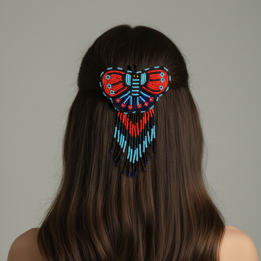 Butterfly Beaded Barrettes with Fringes - Sky Blue & Red