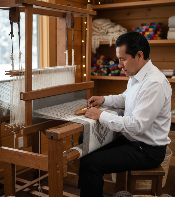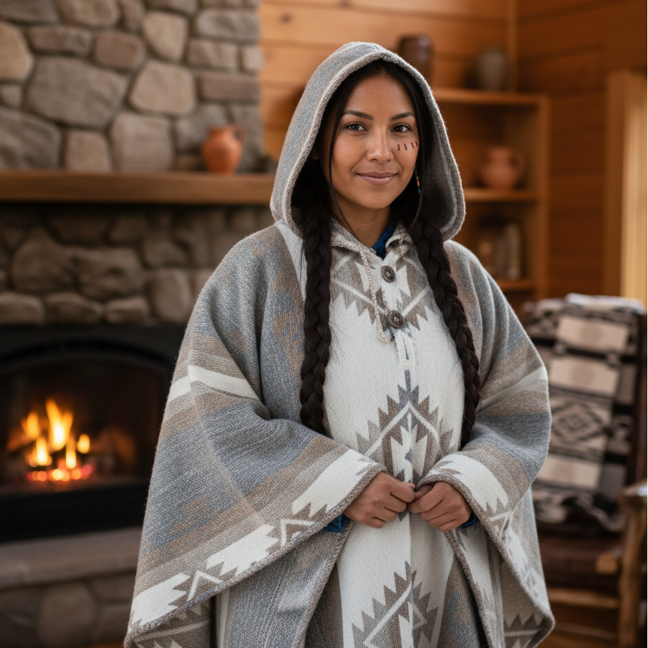 Our jackets come from Indigenous countries—Peru, Guatemala, Mexico, and Ecuador—and are 100% handmade. Our blankets are manufactured in Canada, and our beadwork is made by local artisans in Alberta.