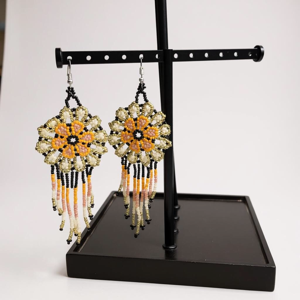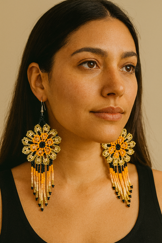 These earrings evoke the warmth and energy of a rising sun. The layered beaded petals form a radiant bloom that cascades into a striking fringe. Whether you’re dressing up a casual look or adding flair to your regalia, these earrings bring color, movement, and cultural pride to any outfit.