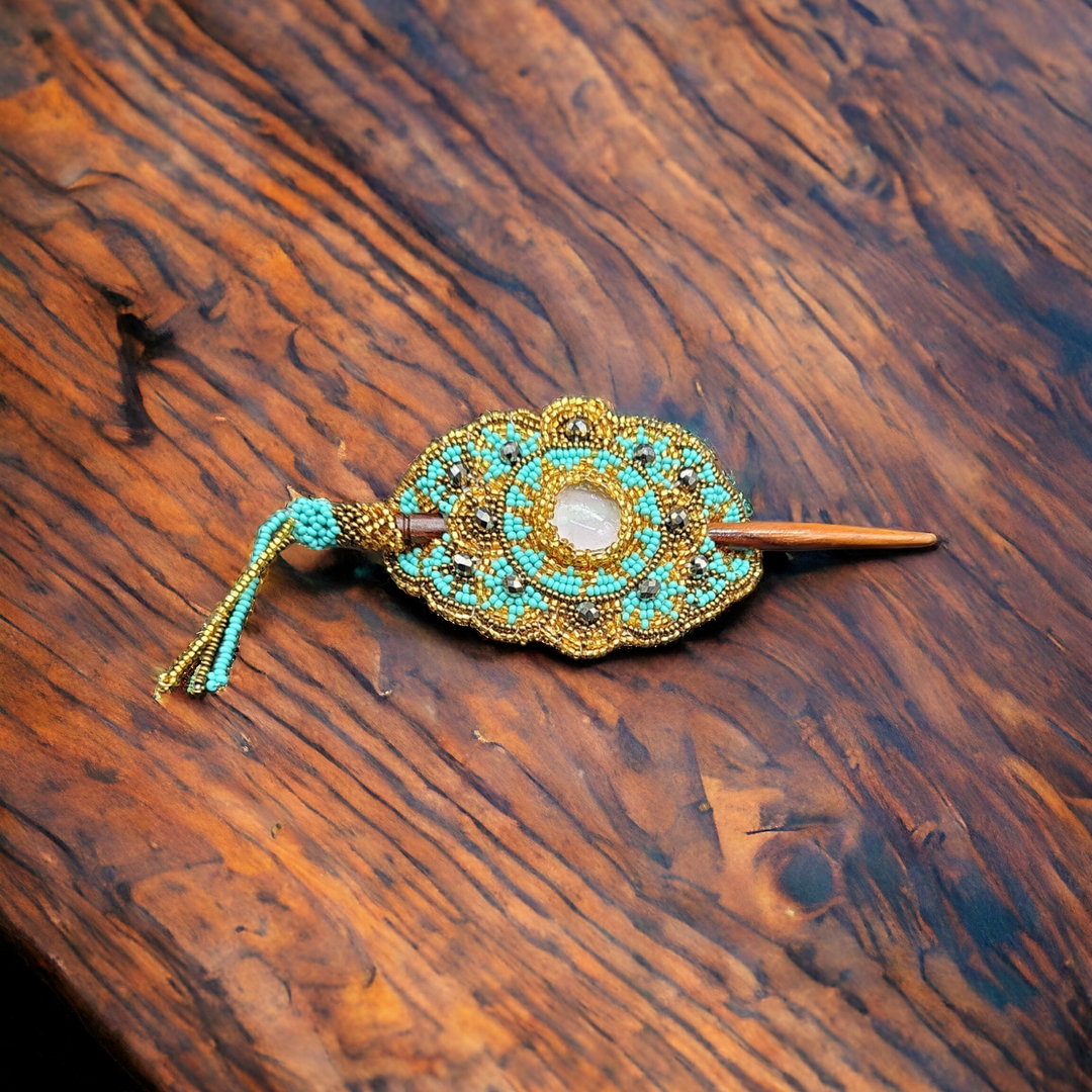 Native American Style Barrette measuring 12 cm wide 11/0 Seed Beaded Barrette., Natural Sheesham Wood Hair Stick..