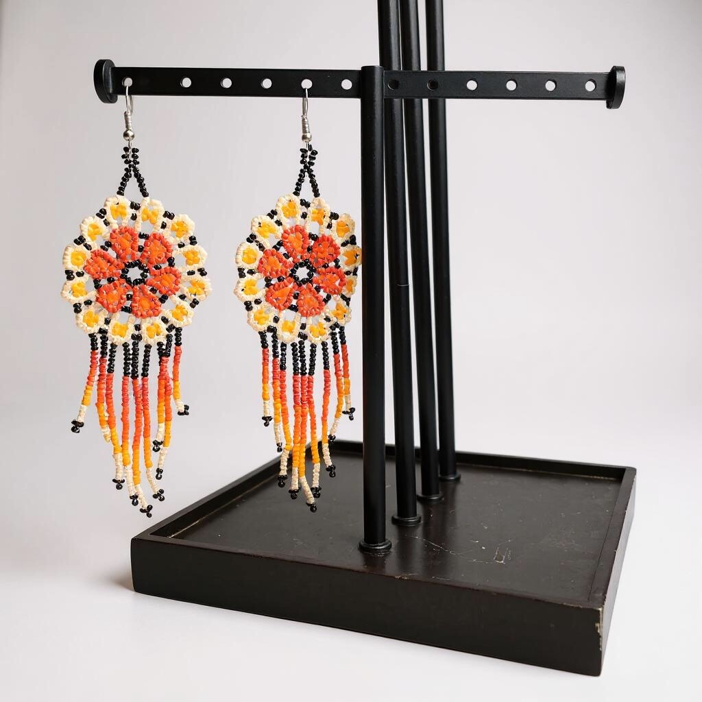 These earrings evoke the warmth and energy of a rising sun. The layered beaded petals form a radiant bloom that cascades into a striking fringe. Whether you’re dressing up a casual look or adding flair to your regalia, these earrings bring color, movement, and cultural pride to any outfit.