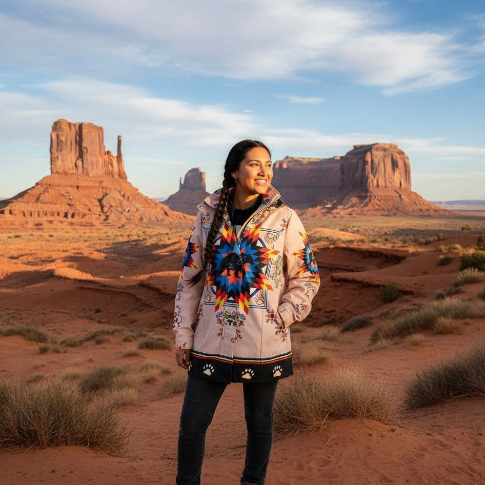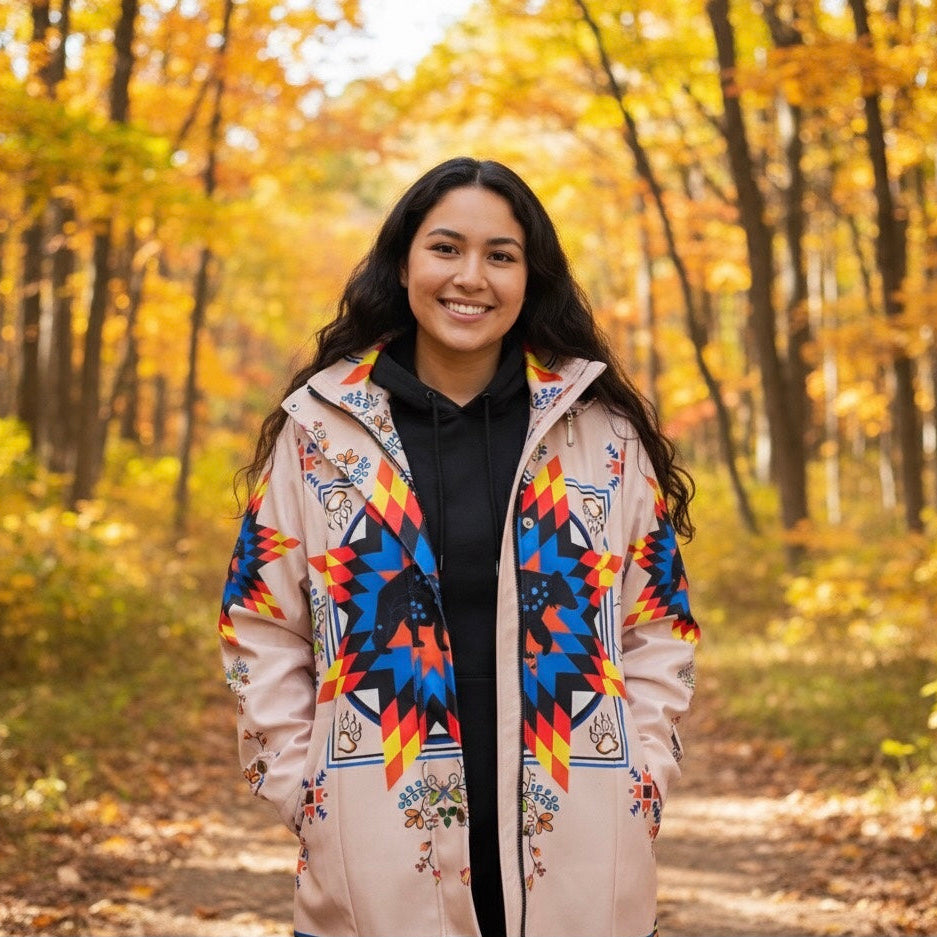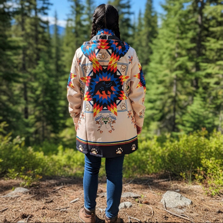 Nos vestes proviennent de pays autochtones (Pérou, Guatemala, Mexique et Équateur) et sont entièrement faites à la main. Nos couvertures sont fabriquées au Canada et nos broderies perlées sont réalisées par des artisans locaux en Alberta.