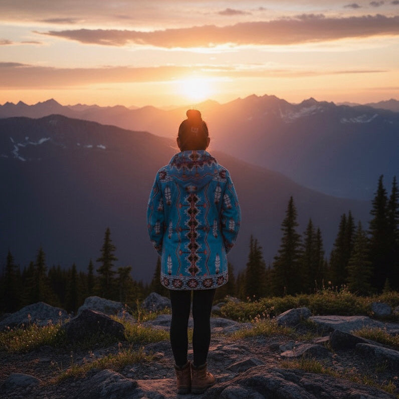 Nos vestes proviennent de pays autochtones (Pérou, Guatemala, Mexique et Équateur) et sont entièrement faites à la main. Nos couvertures sont fabriquées au Canada et nos broderies perlées sont réalisées par des artisans locaux en Alberta.