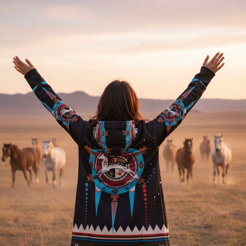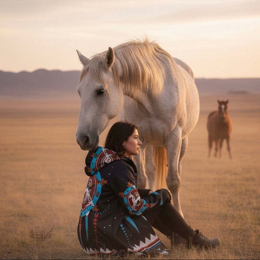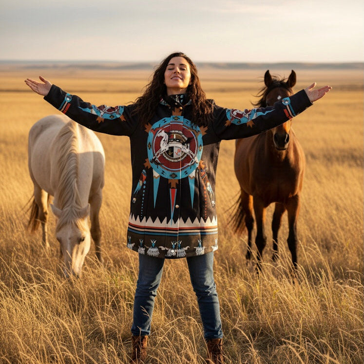 Nos vestes proviennent de pays autochtones (Pérou, Guatemala, Mexique et Équateur) et sont entièrement faites à la main. Nos couvertures sont fabriquées au Canada et nos broderies perlées sont réalisées par des artisans locaux en Alberta.