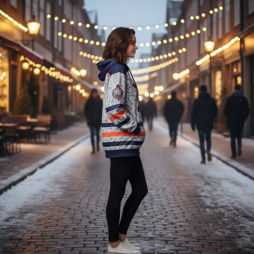 - Conception : Détail à lacets sur le devant et graphismes audacieux des Oilers d'Edmonton
