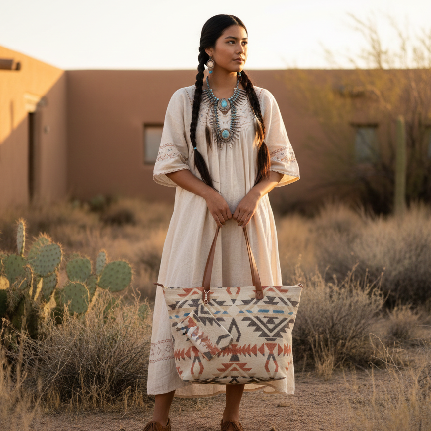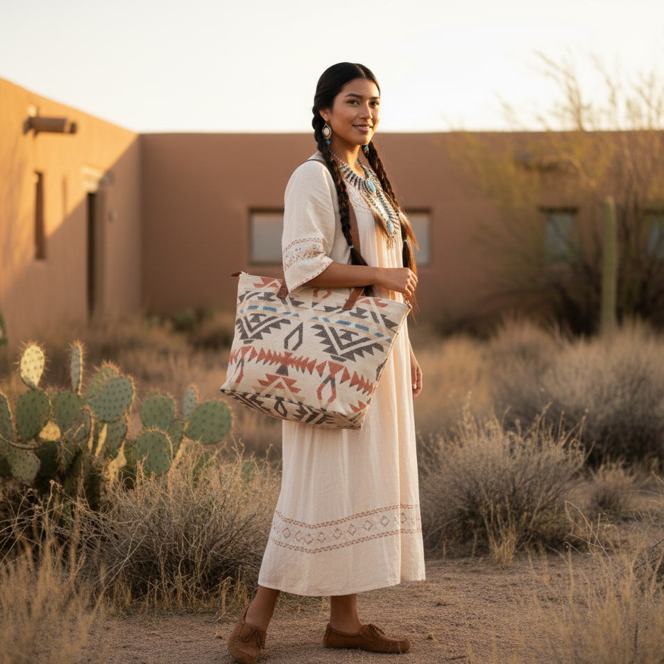 De la collection Oldtribes conçue par Marie Janvier, ce grand sac à motif Native Bag est fabriqué à partir de matériaux écologiques, végétaliens, non toxiques, recyclables et biodégradables.