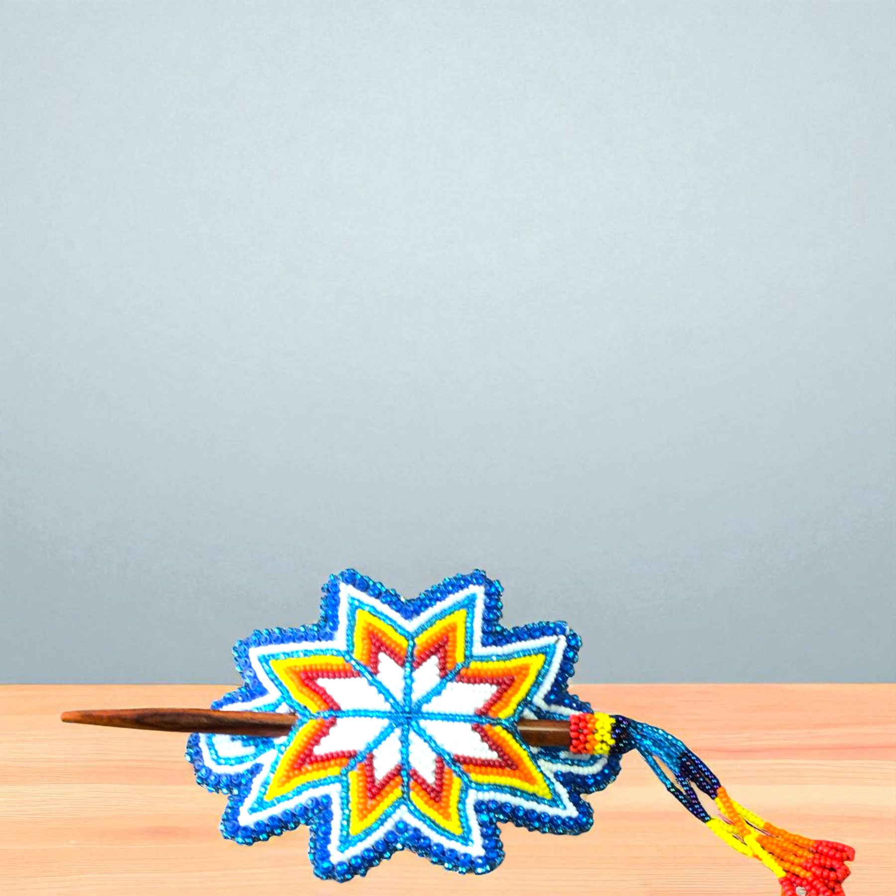 Make a bold statement with this vibrant, handcrafted beaded barrette inspired by traditional Indigenous star motifs. This piece features a radiant eight-point star meticulously woven with premium glass seed beads in fiery shades of red, orange, yellow, and black — symbolizing strength, energy, and connection to culture.