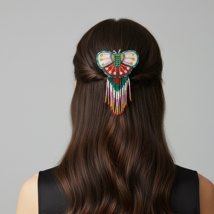 Butterfly Beaded Barrettes with Fringes - Green & Pink
