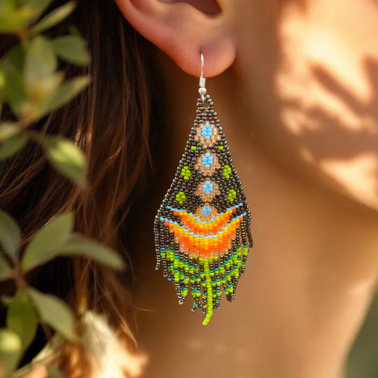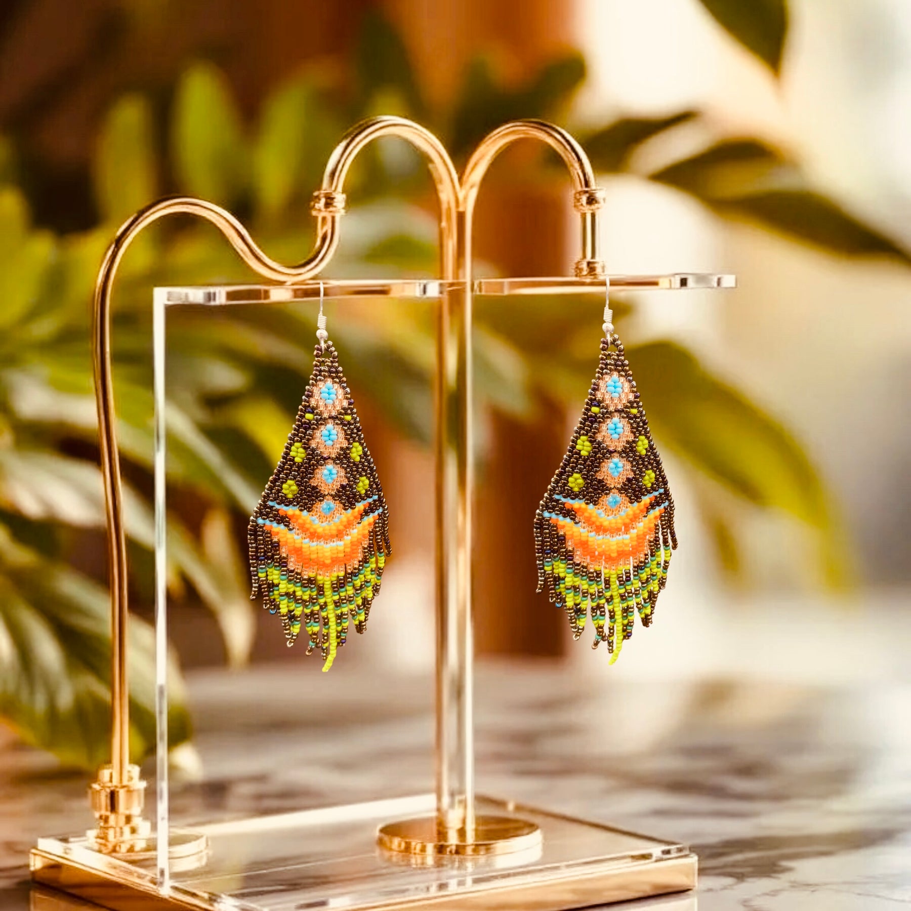 These earrings capture the essence of nature’s fire and flower — bold, radiant, and full of life. The intricate pattern symbolizes blossoming strength and vibrant spirit, while the carefully hand-woven fringe adds soft rhythm and fluidity. Perfect for powwows, festivals, or to elevate your everyday style.