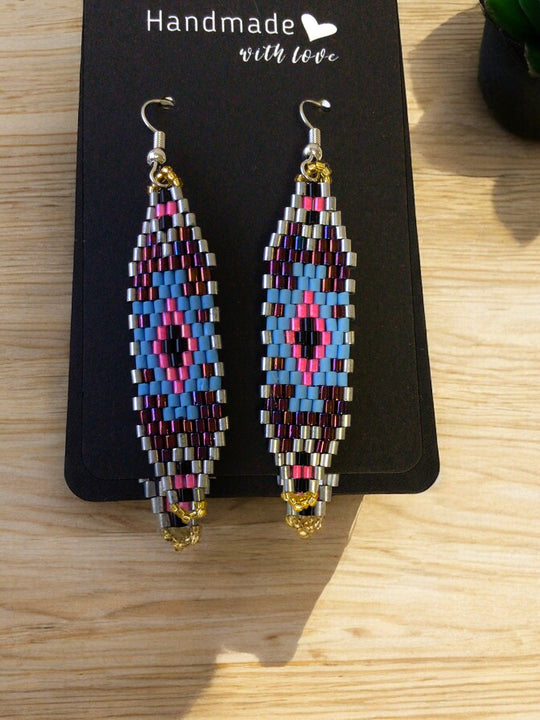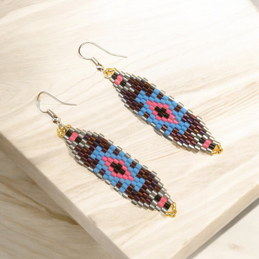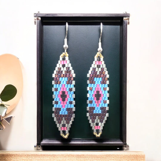These Miyuki glass beaded earrings are crafted using world-renowned Miyuki glass beads, known for their exceptional quality, stunning brilliance, and consistent shape. Perfect for fashion designers, artists, and bead enthusiasts, these earrings are a must-have accessory for those who appreciate native beaded craftsmanship.
