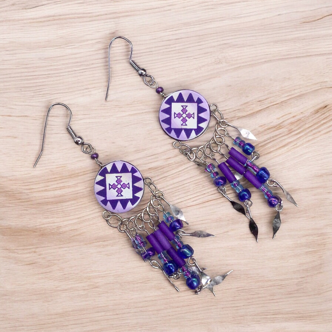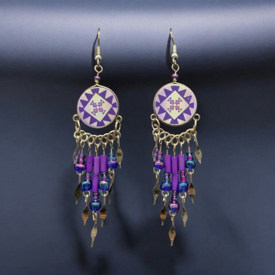 Round, bold design featuring intricate geometric patterns and earthy tones