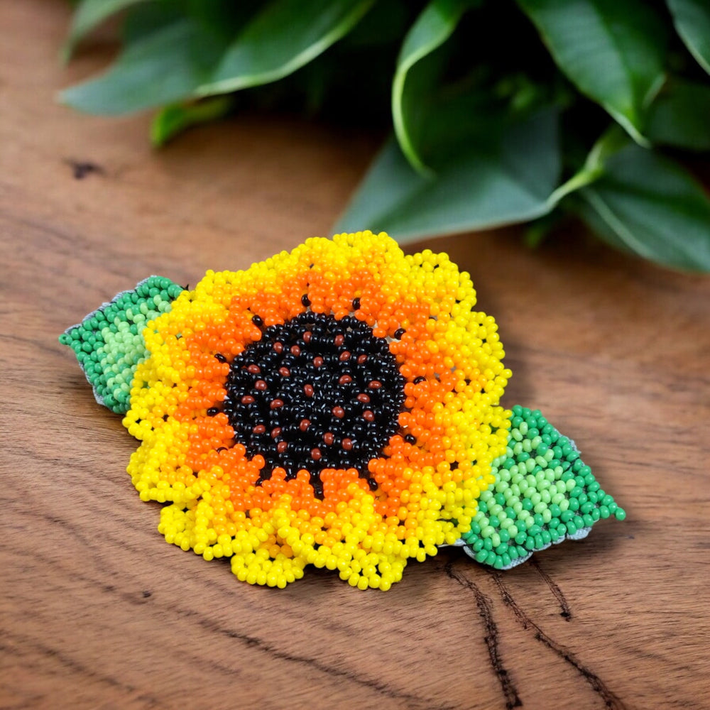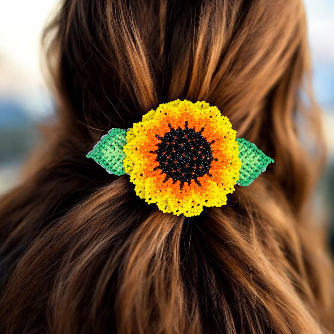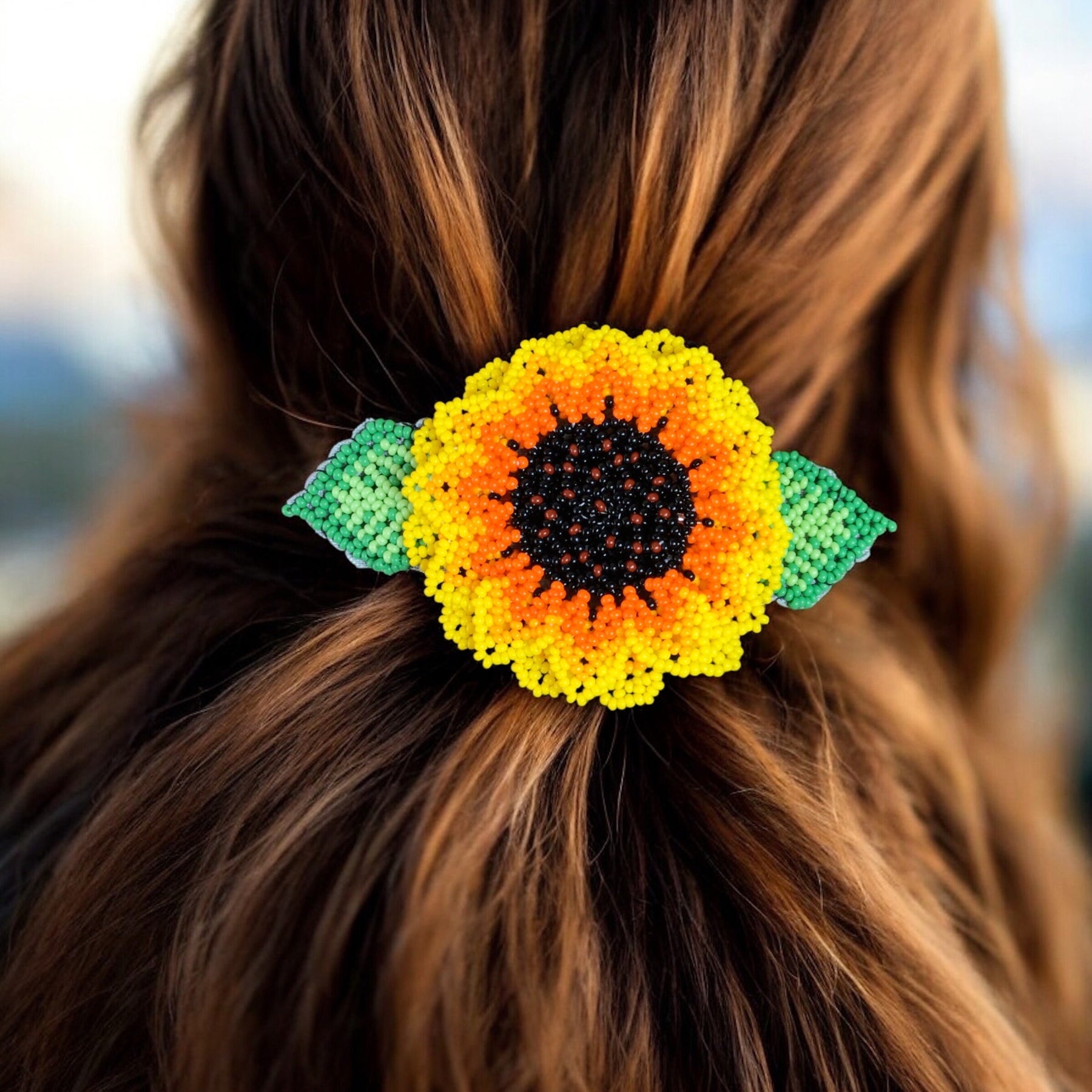 Brighten your hairstyle with this charming Handmade Beaded Sunflower Hair Clip. Carefully crafted with radiant seed beads, this piece captures the joyful essence of a sunflower in bloom.